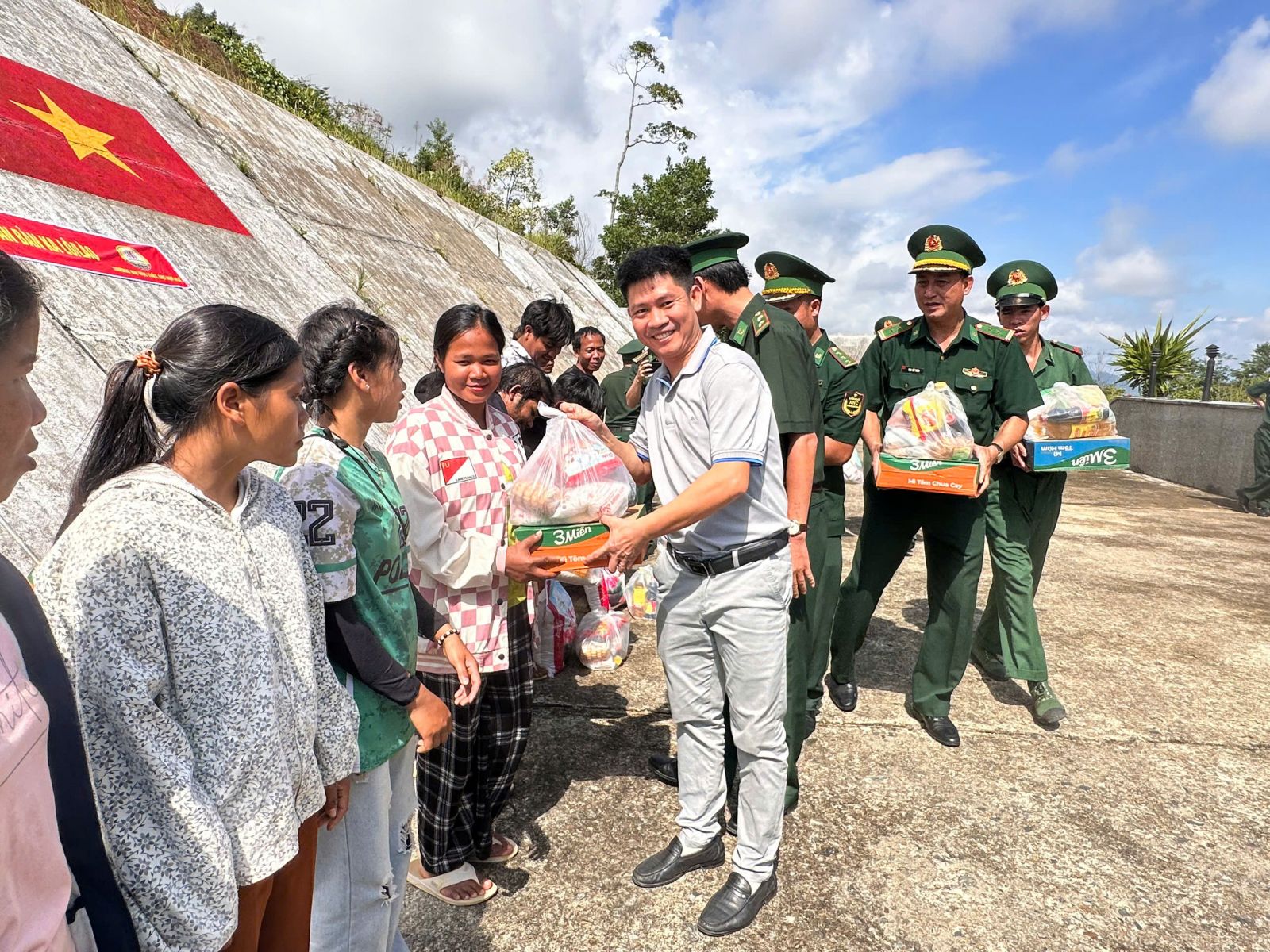 Thầy Nguyễn Sơn Hà, Uỷ viên Thường vụ Đảng uỷ, Trưởng phòng khảo thí- BĐCLGD cùng cán bộ chiến sỹ Đồn Biên phòng A Đớt trao quà cho người dân bản Ka Lô nước bạn Lào.