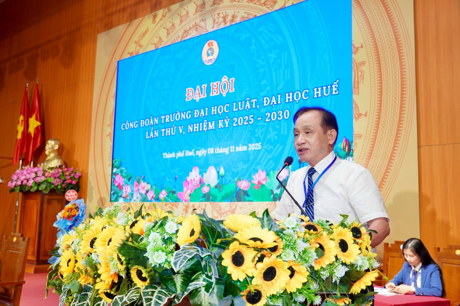 Phát biểu tại Đại hội, PGS.TS. Nguyễn Duân, Chủ tịch Công đoàn Đại học Huế đã ghi nhận và biểu dương những kết quả đạt được của Công đoàn Trường Đại học Luật trong nhiệm kỳ vừa qua. Đồng chí nhấn mạnh, Công đoàn Trường đã thể hiện tinh thần đoàn kết, chủ động, sáng tạo trong việc chăm lo, bảo vệ quyền lợi cho viên chức và người lao động; đồng thời tích cực phối hợp với chính quyền thực hiện hiệu quả các nhiệm vụ chính trị, chuyên môn của Nhà trường. Chủ tịch Công đoàn Đại học Huế tin tưởng rằng trong nhiệm kỳ 2025 – 2030, Công đoàn Trường Đại học Luật sẽ tiếp tục phát huy truyền thống, đổi mới nội dung và phương thức hoạt động, xây dựng đội ngũ đoàn viên ngày càng vững mạnh, góp phần quan trọng vào sự phát triển chung của Đại học Huế.