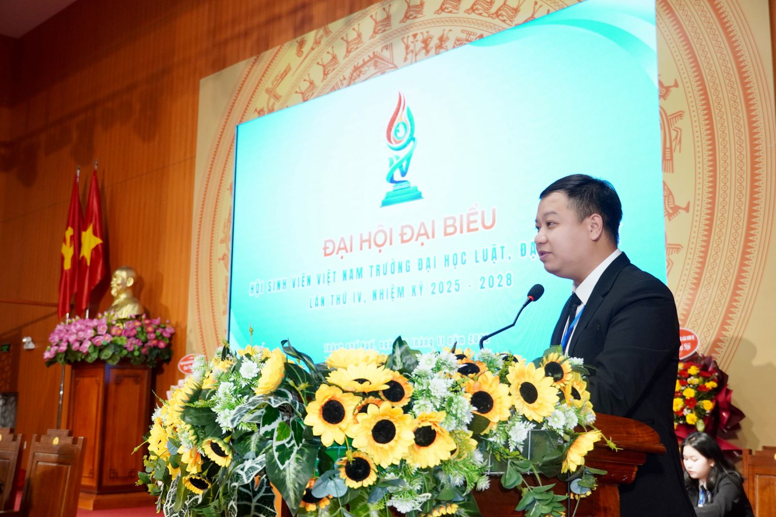 Phát biểu tại Đại hội, TS. Nguyễn Hồng Sơn, Bí thư Đảng ủy, Chủ tịch Hội đồng Trường ghi nhận và biểu dương những kết quả mà Hội Sinh viên đã đạt được trong nhiệm kỳ 2023–2025. Thầy nhấn mạnh vai trò tiên phong, sáng tạo của sinh viên trong các hoạt động học tập, rèn luyện, nghiên cứu khoa học và tình nguyện cộng đồng; đồng thời đề nghị Hội Sinh viên tiếp tục đổi mới, bám sát nhiệm vụ đào tạo của Nhà trường, phát huy trí tuệ, bản lĩnh và tinh thần trách nhiệm của tuổi trẻ Luật Huế trong nhiệm kỳ mới.