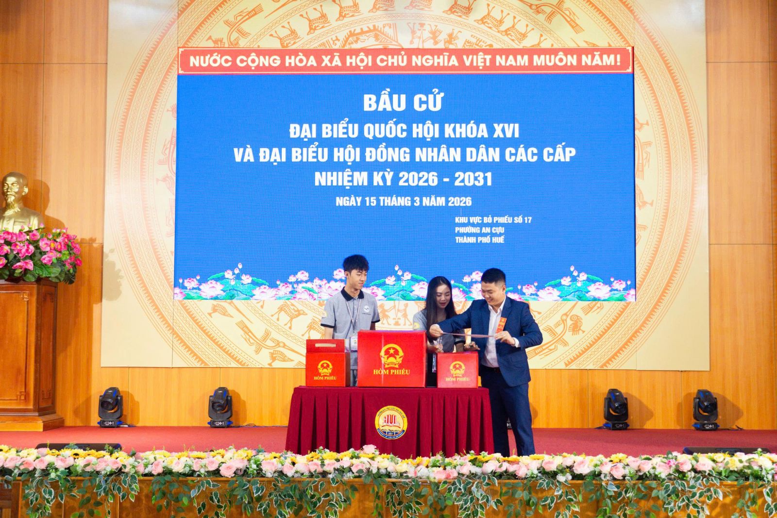 Ngày cập nhật: 15-03-2026Ngày 15/3/2026, hơn 3.000 sinh viên Trường Đại học Luật, Đại học Huế tham gia bầu cử đại biểu Quốc hội khóa XVI và đại biểu Hội đồng nhân dân các cấp nhiệm kỳ 2026–2031 tại khu vực bỏ phiếu số 17, phường An Cựu, Thành phố Huế theo quy định.