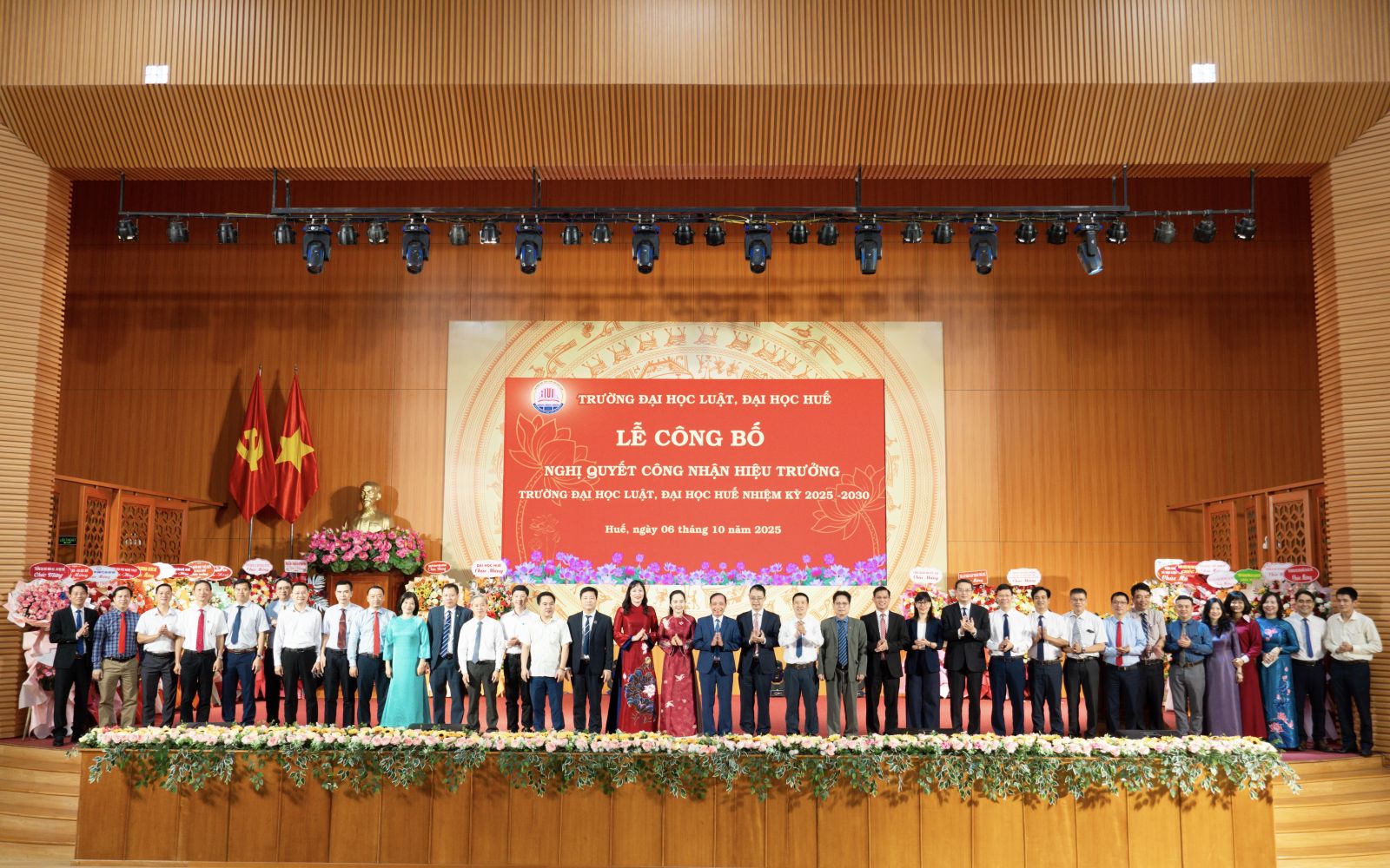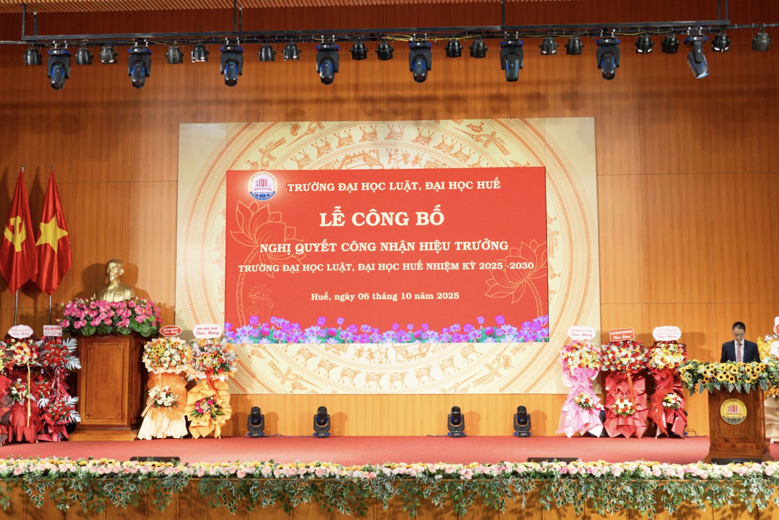 Lễ Công bố Nghị quyết công nhận Hiệu trưởng nhiệm kỳ 2025-2030 và trao các Quyết định về công tác bổ nhiệm lại, bổ nhiệm trưởng, phó các đơn vị thuộc, trực thuộc Trường diễn ra trong không khí trang trọng, thể hiện sự đồng thuận, thống nhất, đoàn kết của tập thể Trường Đại học Luật, Đại học Huế tiếp tục thể hiện quyết tâm của Trường Đại học Luật, Đại học Huế trong việc tiếp tục khẳng định vị thế là một trong những cơ sở đào tạo luật học uy tín, gắn liền với sứ mạng “Đào tạo đại học, thạc sĩ, tiến sĩ; thực hiện các hoạt động khoa học và công nghệ, phục vụ cộng đồng về lĩnh vực pháp luật; cung cấp nguồn nhân lực, sản phẩm khoa học công nghệ có chất lượng cao, tư vấn chính sách pháp luật đáp ứng nhu cầu phát triển của cả nước và khu vực.” cùng tầm nhìn “Đến năm 2030 trở thành trường đại học tự chủ toàn diện, lấy tự chủ tài chính làm tiền đề; phát huy mọi nguồn lực và giá trị truyền thống, giá trị cốt lõi trong đào tạo, khoa học công nghệ, phục vụ cộng đồng, văn hoá chất lượng; khẳng định thương hiệu trong tốp đầu đào tạo luật ở Việt Nam, có tầm ảnh hưởng trong khu vực.”