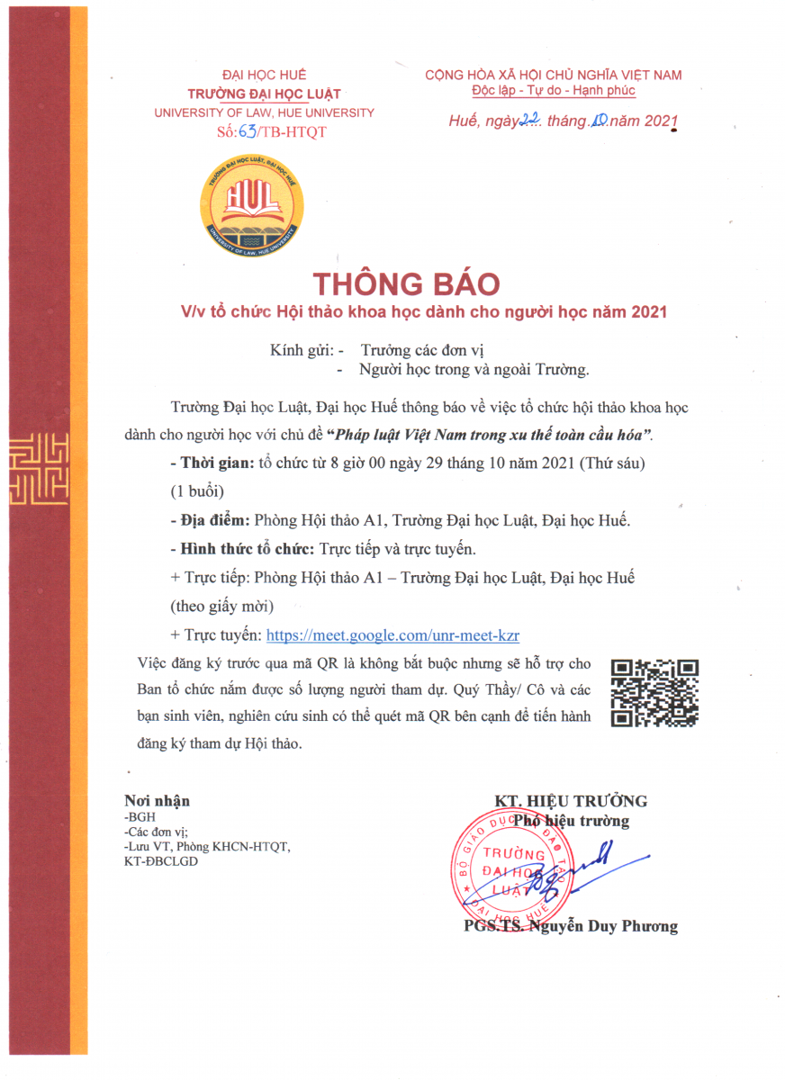 Thông báo thời gian tổ chức hội thảo khoa học dành cho người học năm 2021