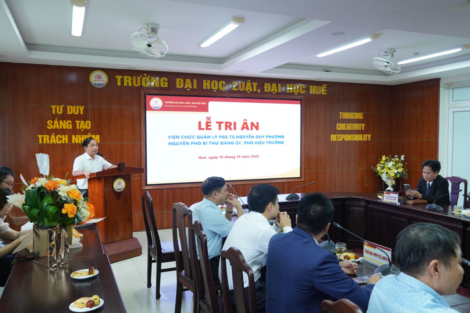 Trong phần phát biểu của mình, PGS.TS. Nguyễn Duy Phương xúc động bày tỏ lòng cảm ơn sâu sắc đến Đảng ủy, Ban Giám hiệu, tập thể viên chức, người lao động Trường Đại học Luật, Đại học Huế đã luôn tin tưởng, đồng hành và tạo điều kiện để thầy hoàn thành tốt nhiệm vụ trong suốt quá trình công tác. Thầy gửi gắm niềm tin rằng, với tinh thần đoàn kết, năng động và sáng tạo, Nhà trường sẽ tiếp tục gặt hái được nhiều thành công hơn nữa trong thời gian tới.