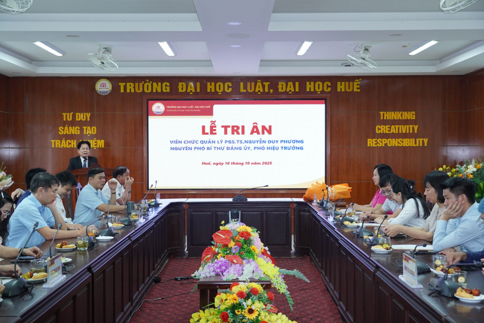 Ngày cập nhật: 16-10-2025Trong không khí thân mật và ấm cúng, sáng ngày 16/10/2025 Trường Đại học Luật, Đại học Huế tổ chức buổi gặp mặt tri ân viên chức quản lý đối với PGS.TS. Nguyễn Duy Phương – nguyên Phó Bí thư Đảng ủy, nguyên Phó Hiệu trưởng Nhà trường, người thầy mẫu mực, người lãnh đạo tận tâm đã có nhiều năm cống hiến cho sự phát triển bền vững của Trường Đại học Luật, Đại học Huế.