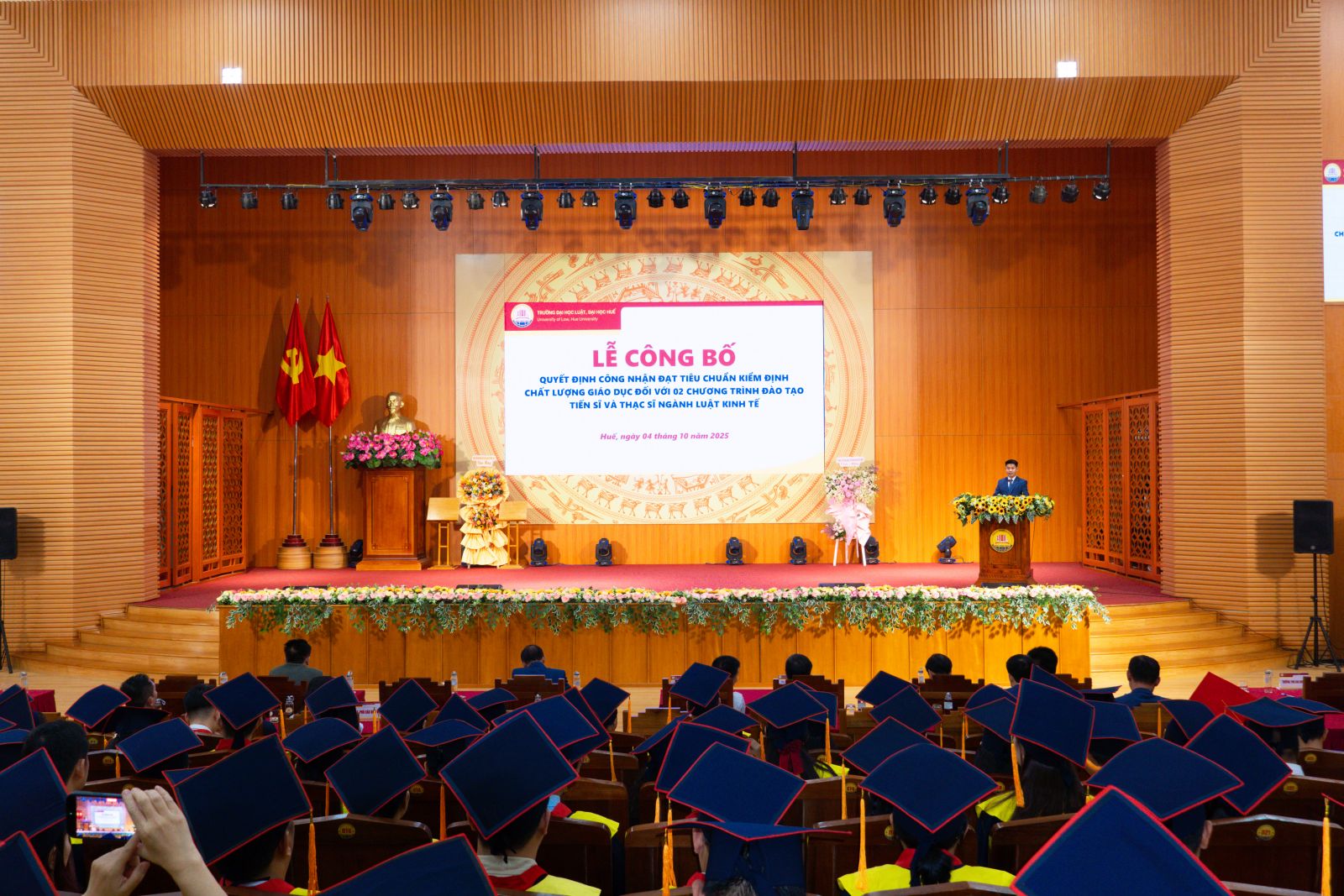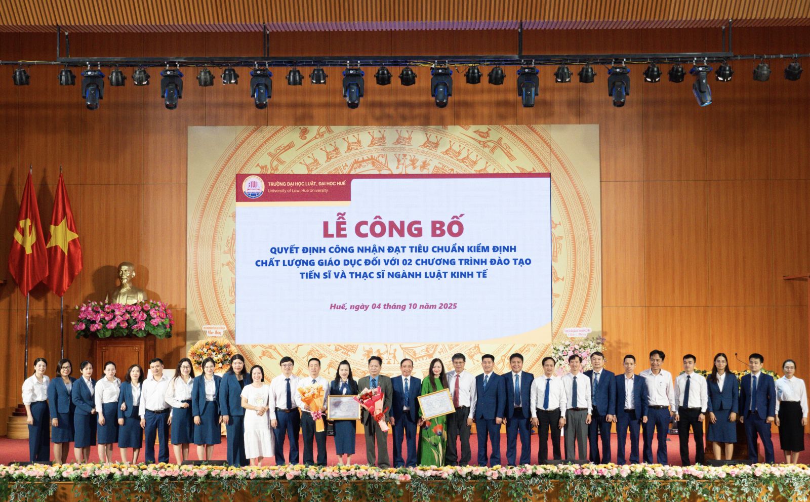 Ngày cập nhật: 04-10-2025Chiều ngày 04/10/2025, Trường Đại học Luật, Đại học Huế phối hợp với Trung tâm Kiểm định chất lượng giáo dục Thăng Long tổ chức Lễ công bố Quyết định công nhận đạt tiêu chuẩn kiểm định chất lượng giáo dục đối với 02 chương trình đào tạo thạc sĩ và tiến sĩ ngành Luật Kinh tế. Sự kiện đánh dấu bước tiến quan trọng trong hành trình bảo đảm và nâng cao chất lượng đào tạo của Nhà trường, đồng thời hoàn tất kiểm định chất lượng cho toàn bộ các bậc đào tạo từ cử nhân đến tiến sĩ.