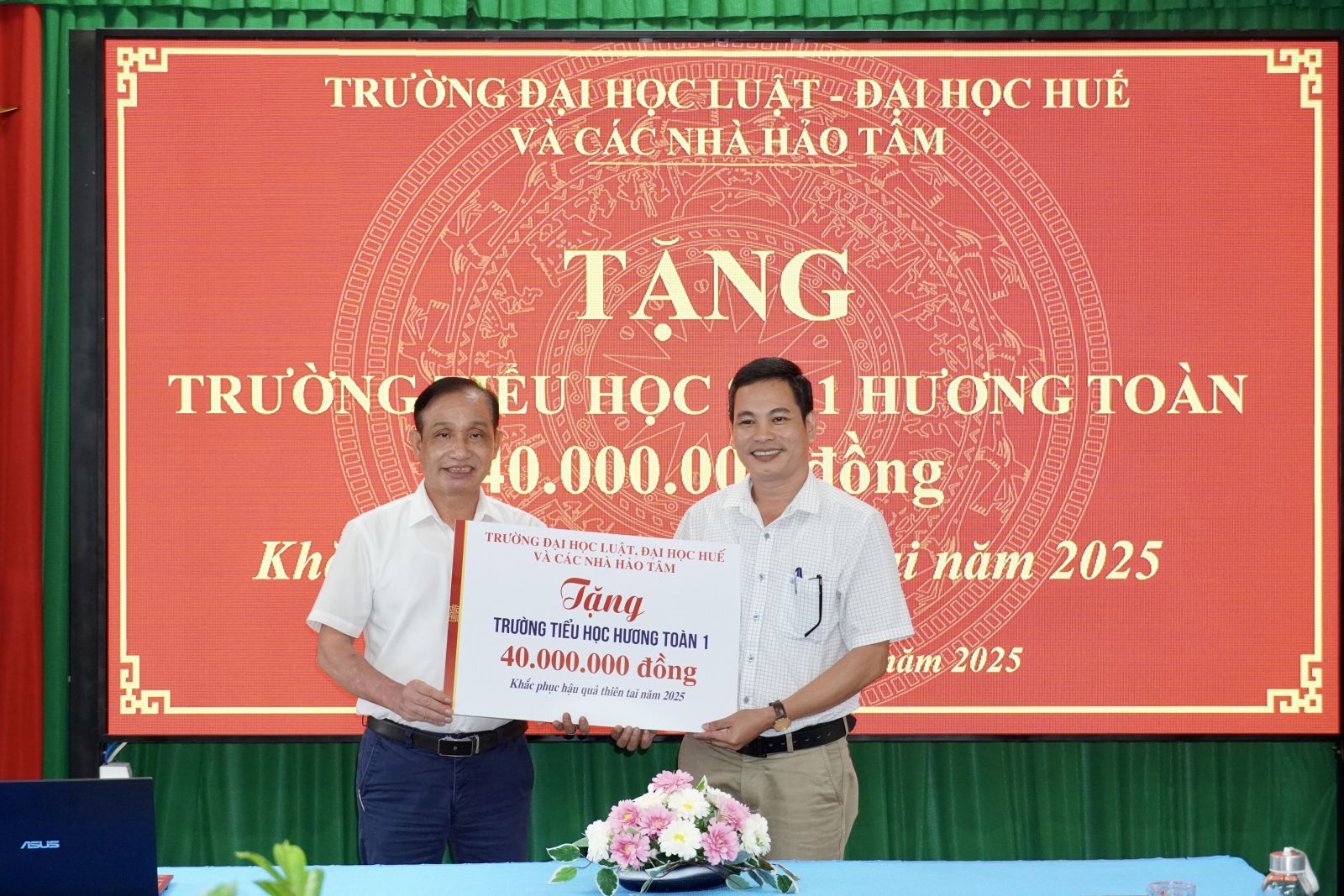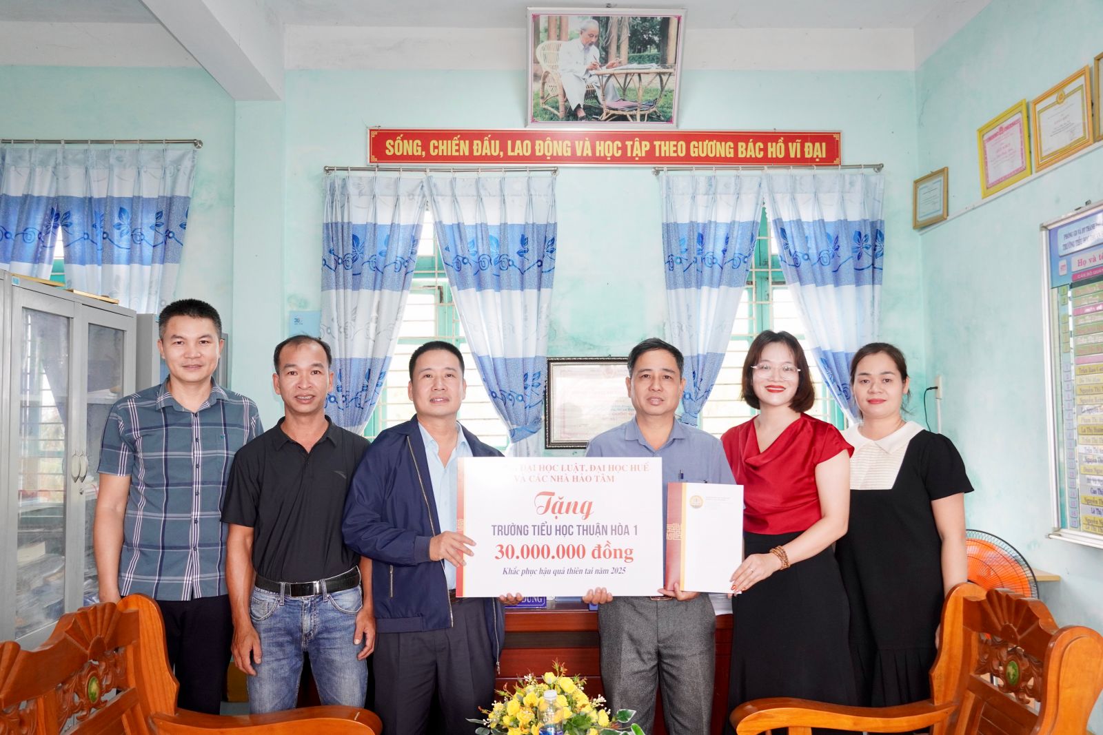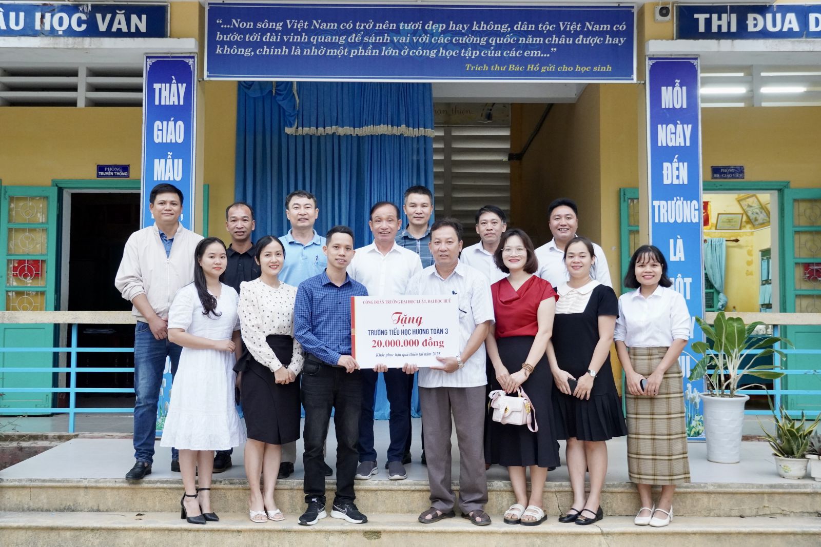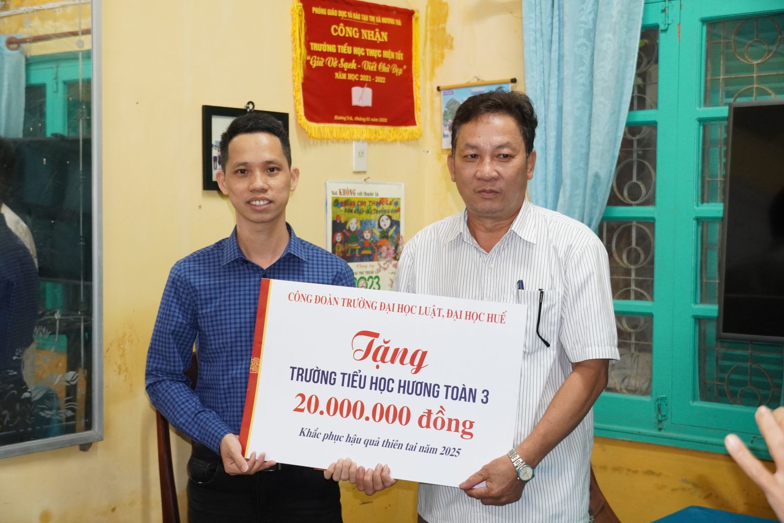 Tại chương trình, đoàn đã trao tặng tổng kinh phí 100 triệu đồng cho 03 trường bị ảnh hưởng nặng sau bão lũ, cụ thể: Trường THPT Hoá Châu: 30 triệu đồng; Trường Tiểu học Hương Toàn 1 (phường Kim Trà): 40 triệu đồng; Trường Tiểu học Thuận Hoà 1 (phường Hoá Châu): 30 triệu đồng. Dịp này, Công đoàn Trường Đại học Luật, Đại học Huế cũng trao tặng 20 triệu đồng hỗ trợ Trường Tiểu học Hương Toàn 3, góp phần khắc phục thiệt hại và ổn định việc dạy, học sau lũ.