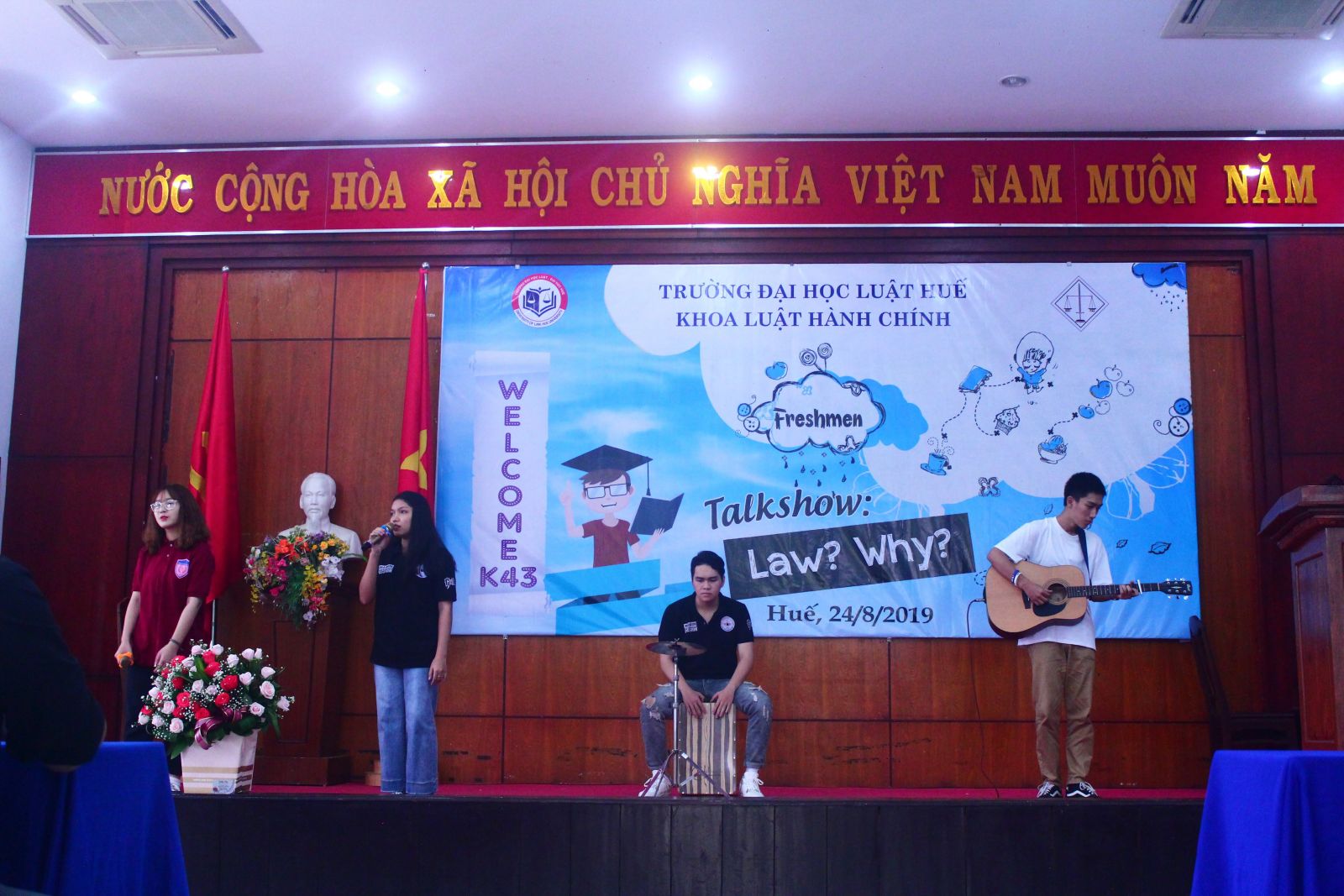 Mở đầu chương trình gặp mặt là các tiết mục văn nghệ đặc sắc do các thành viên của CLB Guitar trực thuộc LCĐ Khoa cùng đại diện BCH Khoa Luật Hành chính biểu diễn thay cho lời chào mừng các bạn Tân sinh viên K43 đến với mái nhà chung Đại học Luật.