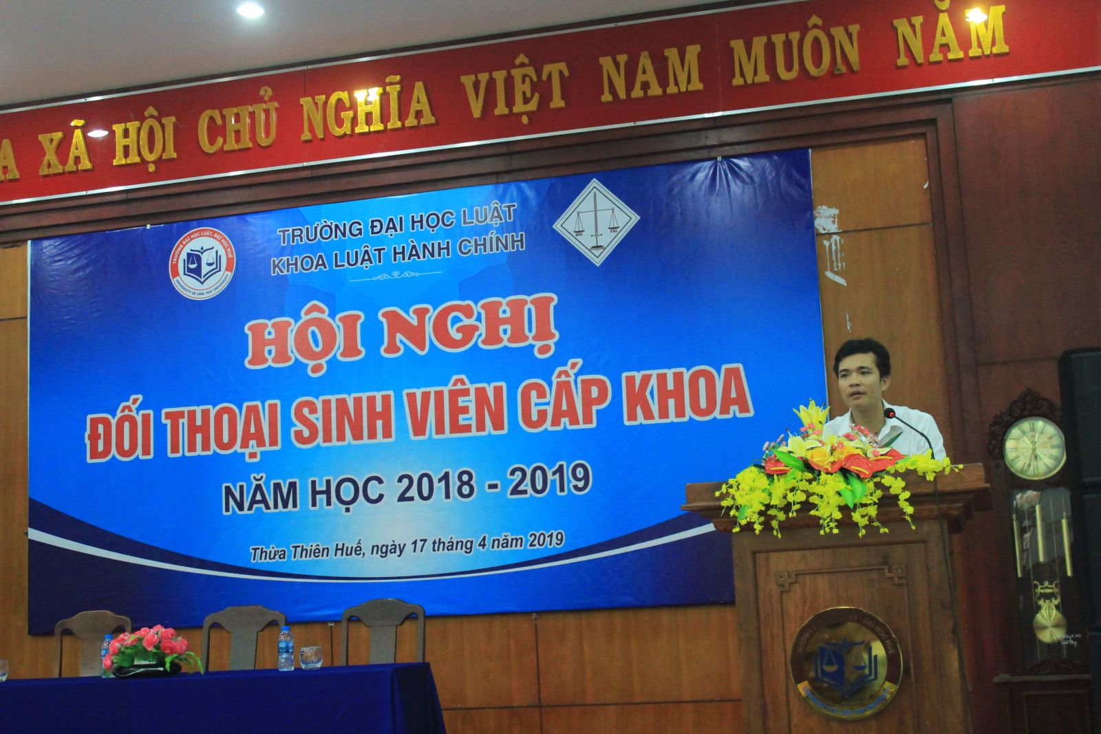 Ngày cập nhật: 17-04-2019Thực hiện quyết định dạy và học năm học 2018 - 2019 của Hiệu trưởng Trường Đại học Luật, Đại học Huế, vào lúc 17h30 ngày 17/04/2019, tại Hội trường B, Khoa Luật Hành chính đã tổ chức Hội nghị đối thoại sinh viên cấp Khoa năm học 2018 - 2019. Đến dự với Hội nghị có sự hiện diện của Thầy Ngô Minh Tiến - Giám đốc Trung tâm Thông tin thư viện trường Đại học Luật, Đại học Huế; về phía khoa chuyên môn, có sự tham dự của ThS. Trần Công Trung - Phó Bí thư chi bộ khoa Luật Hành chính, ThS. Hoàng Thị Ái Quỳnh - Bí thư Liên chi Đoàn Khoa Luật Hành, Th.S. Mai Thị Diệu Thúy - Trưởng bộ môn Lý luận - Lịch sử, Th.S Bùi Thị Thuận Ánh - Trưởng bộ môn Luật Hành chính cùng sự có mặt đông đủ của các Giảng viên và sinh viên của Khoa Luật Hành chính.