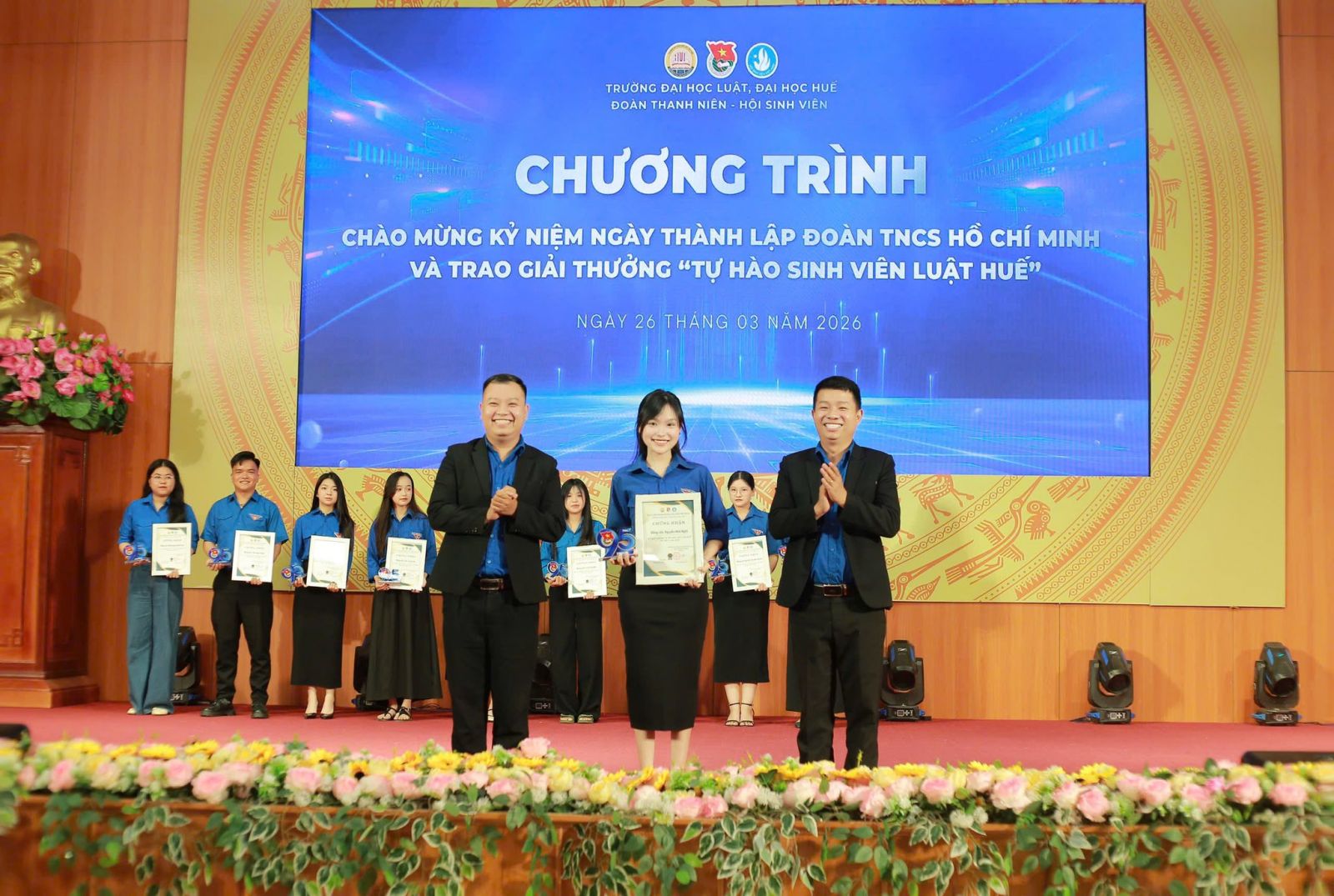 Bên cạnh đó, niềm tự hào của Khoa Luật Quốc tế còn được viết tiếp bởi những gương mặt trẻ, những cán bộ Đoàn luôn hiện diện trong mọi hoạt động bằng sự nhiệt tình, trách nhiệm và được vinh danh, trao giải thưởng “Tự hào sinh viên Luật Huế” lần thứ I năm 2026: Phạm Ngọc Minh Anh – Phó Bí thư LCĐ Khoa Luật Quốc tế; Nguyễn Nhã Nghi – Ủy viên BCH LCĐ Khoa Luật Quốc tế; Trần Ngọc Nhân – Ủy viên BCH LCĐ Khoa Luật Quốc tế; Lê Huyền Trang – Ủy viên BCH LCĐ Khoa Luật Quốc tế