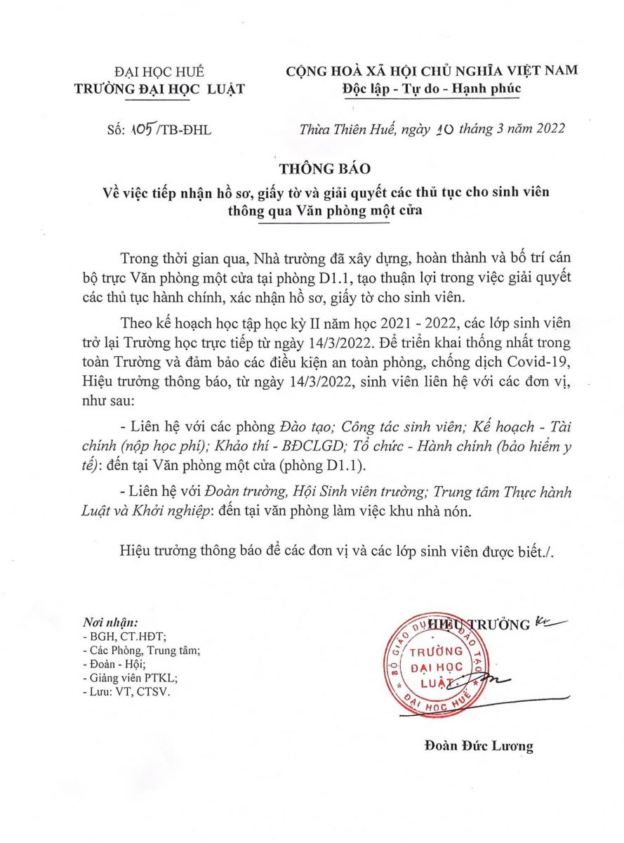 Ngày cập nhật: 10-03-2022Thông báo về việc tiếp nhận hồ sơ, giấy tờ và giải quyết các thủ tục cho sinh viên thông qua Văn phòng một cửa.!