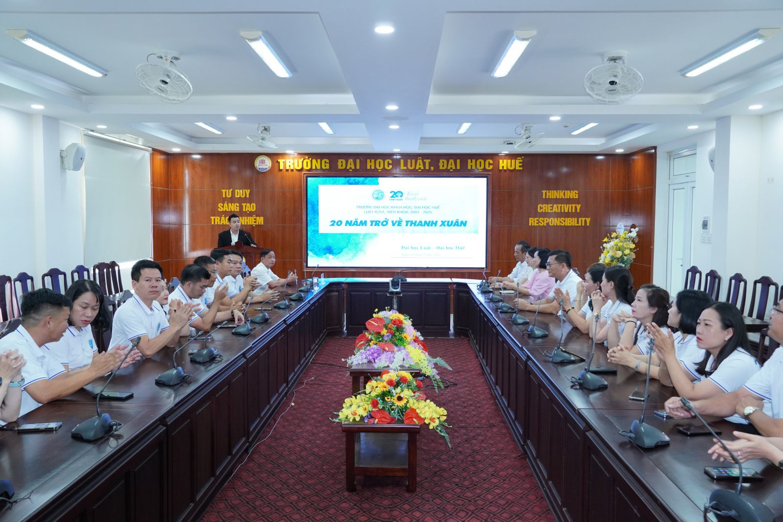 Trong không khí xúc động, các cựu sinh viên lớp Luật K25A đã gửi lời tri ân đến thầy cô, ôn lại những kỷ niệm thuở sinh viên và bày tỏ niềm tự hào khi được học tập, trưởng thành từ mái trường.