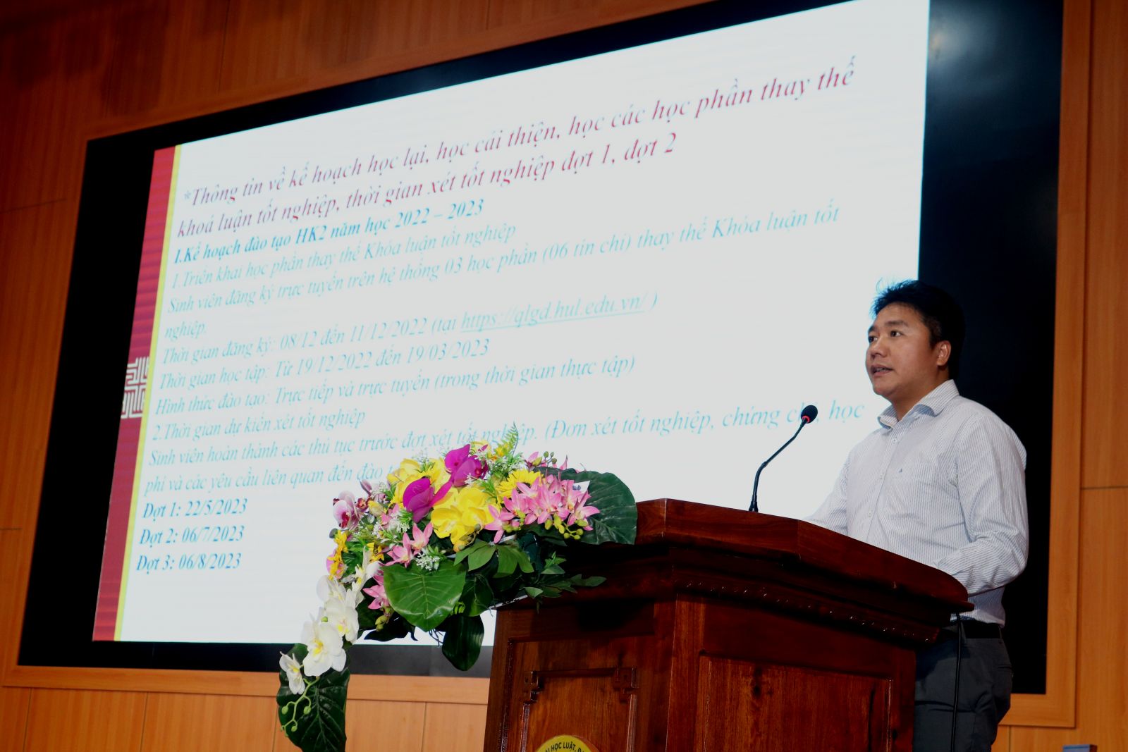 Tại chương trình sinh viên khóa 43 đã được các thầy, cô cung cấp các thông tin cần thiết: Kế hoạch học tập năm học 2022-2023 dành cho Khoá 43, kế hoạch thi kết thúc học phần; thực tập tốt nghiệp, tài chính, rà soát các điều kiện chuẩn đầu ra về Ngoại ngữ, Giáo dục thể chất, ANQP; Thông tin kế hoạch tổ chức học kỳ phụ, triển khai lịch nộp hồ sơ và điều kiện xét tốt nghiệp,..