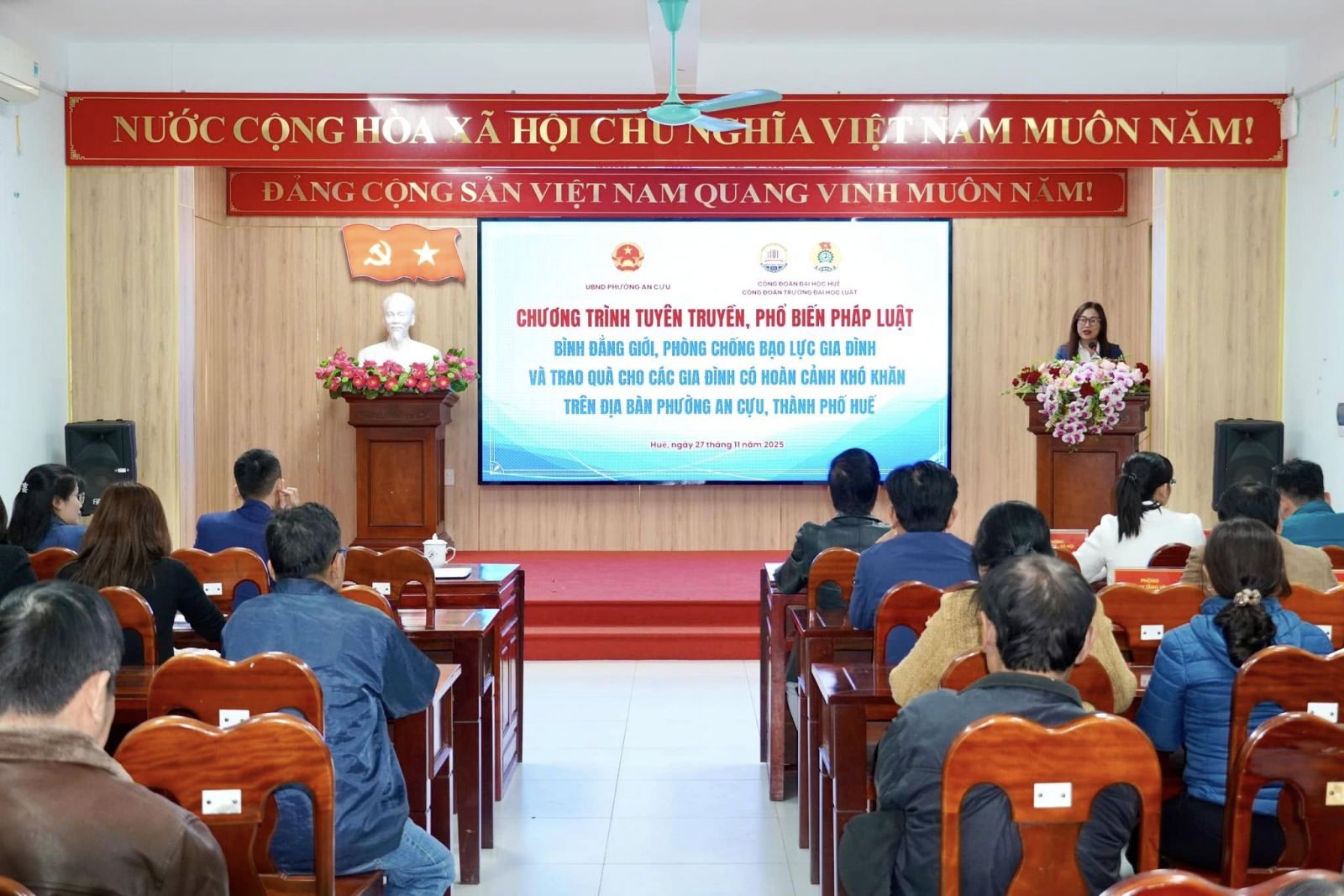 Ngày cập nhật: 27-11-2025Chiều 27/11, Công đoàn Trường Đại học Luật, Đại học Huế phối hợp với UBND phường An Cựu tổ chức Chương trình tuyên truyền, tư vấn pháp luật về bình đẳng giới, phòng chống bạo lực gia đình và trao quà cho các hộ gia đình có hoàn cảnh khó khăn trên địa bàn.