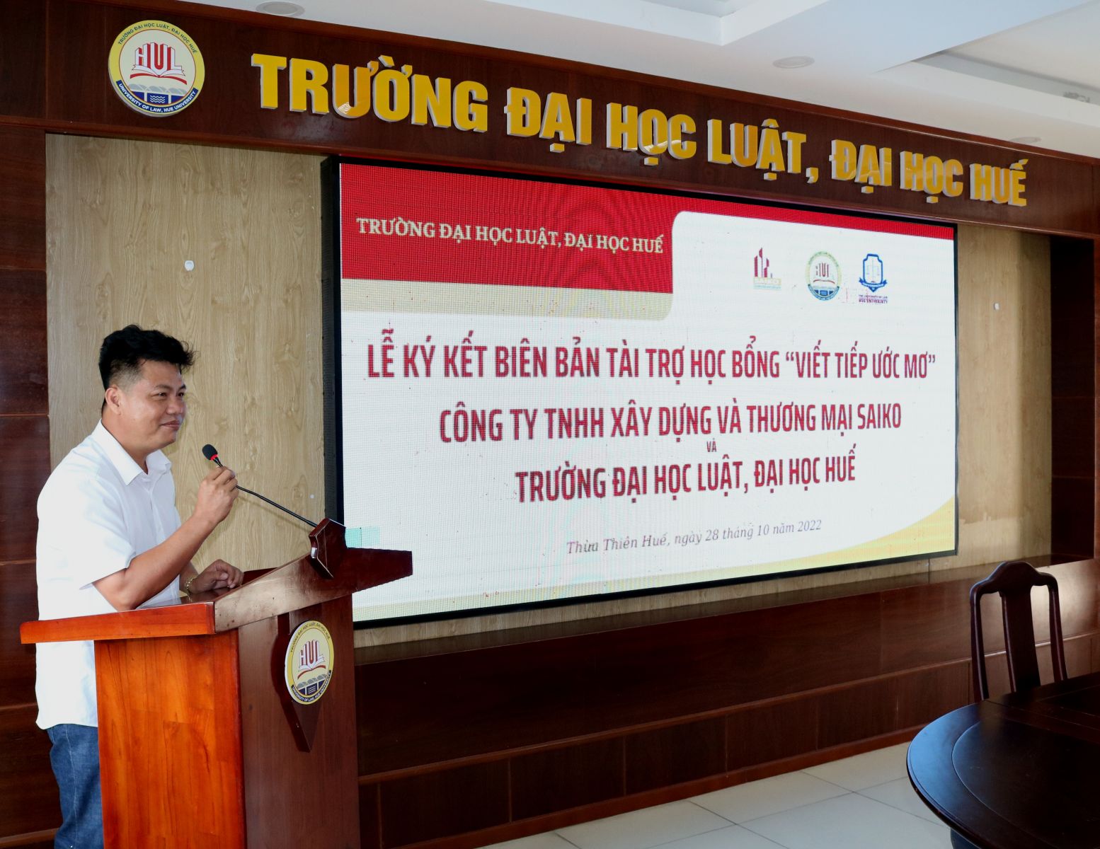 Tại buổi lễ, Ông Phạm Thanh Tùng, Giám đốc Công ty TNHH Xây dựng và Thương mại Saiko và PGS.TS. Đoàn Đức Lương, Hiệu trưởng đã tiến hành ký kết biên bản thỏa thuận về cam kết cấp học bổng cho sinh viên Trường Đại học Luật, Đại học Huế. Nhân dịp này, Ông Phạm Thanh Tùng cũng đã trao 02 suất học bổng toàn phần trong 4 năm học với trị giá 420 triệu đồng cho hai sinh viên.