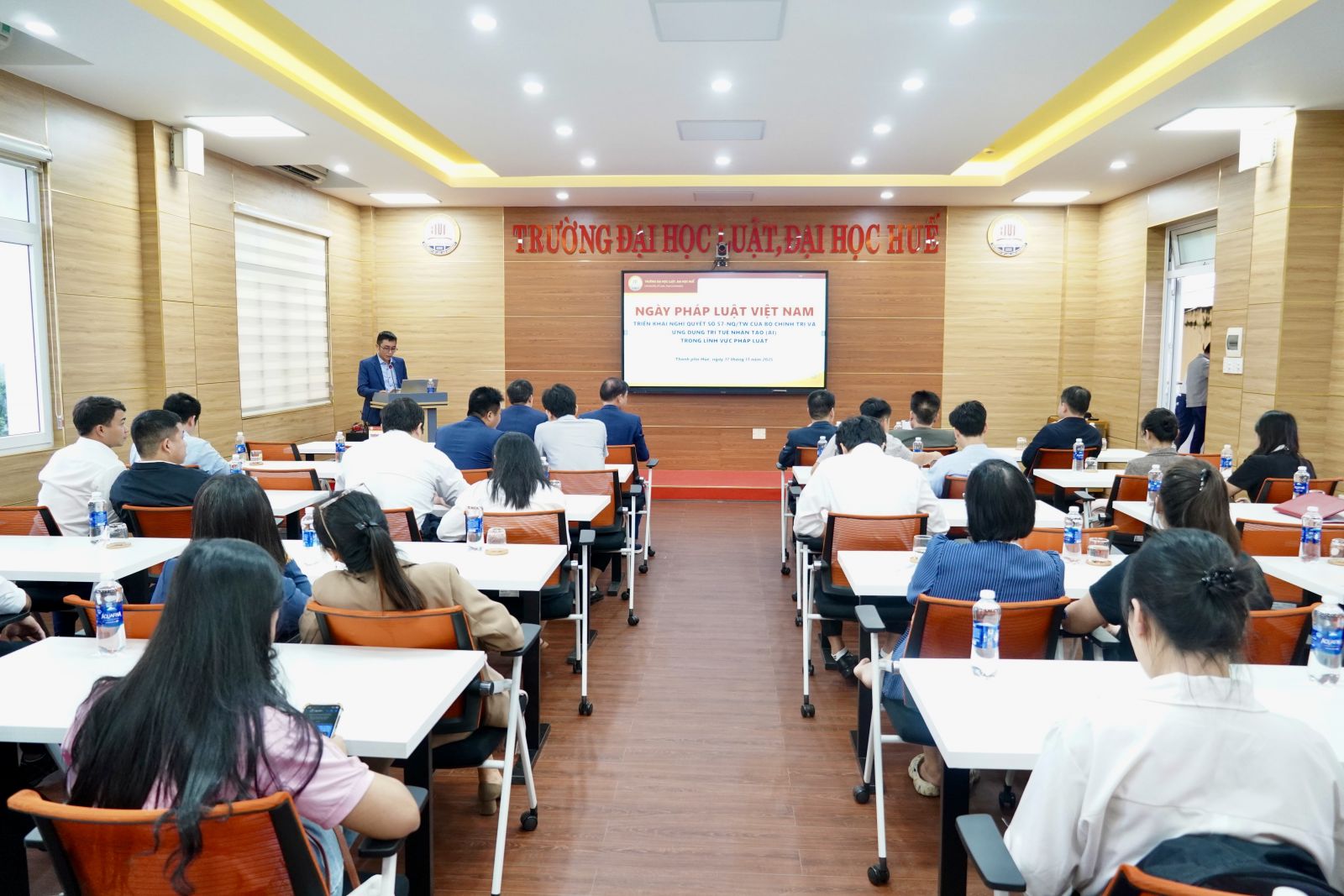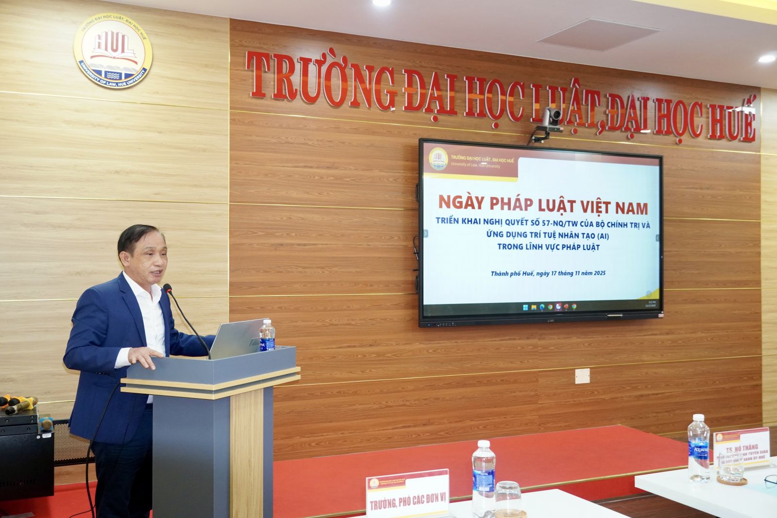Ngày cập nhật: 17-11-2025Nhằm hưởng ứng Ngày Pháp luật Việt Nam, chiều ngày 17/11/2025, Trường Đại học Luật, Đại học Huế tổ chức chương trình thường niên với chủ đề “Triển khai Nghị quyết số 57-NQ/TW của Bộ Chính trị và ứng dụng trí tuệ nhân tạo (AI) trong lĩnh vực pháp luật”. Chủ đề năm nay thể hiện quyết tâm của Nhà trường trong việc thúc đẩy đổi mới sáng tạo, chuyển đổi số và tích hợp công nghệ hiện đại vào nghiên cứu, giảng dạy và thực hành pháp luật.