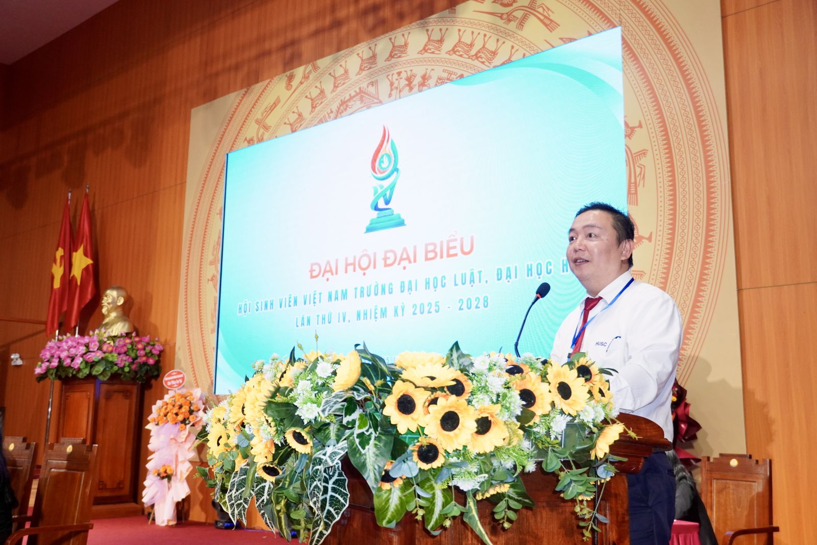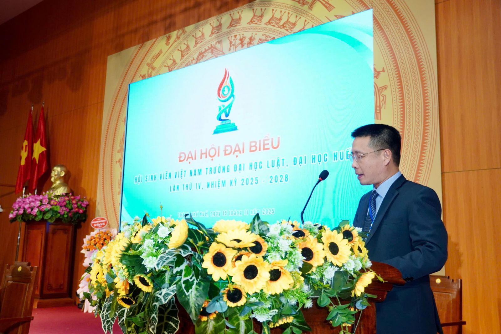 Phát biểu tại Đại hội, TS. Nguyễn Hồng Sơn, Bí thư Đảng ủy, Chủ tịch Hội đồng Trường ghi nhận và biểu dương những kết quả mà Hội Sinh viên đã đạt được trong nhiệm kỳ 2023–2025. Thầy nhấn mạnh vai trò tiên phong, sáng tạo của sinh viên trong các hoạt động học tập, rèn luyện, nghiên cứu khoa học và tình nguyện cộng đồng; đồng thời đề nghị Hội Sinh viên tiếp tục đổi mới, bám sát nhiệm vụ đào tạo của Nhà trường, phát huy trí tuệ, bản lĩnh và tinh thần trách nhiệm của tuổi trẻ Luật Huế trong nhiệm kỳ mới.