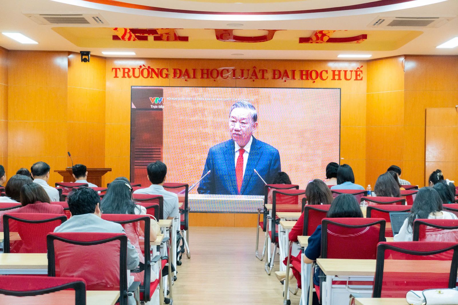 Tại điểm cầu Đại học Huế có sự tham dự của đồng chí Nguyễn Hồng Sơn, Bí thư Đảng uỷ. Tại điểm cầu Trường Đại học Luật, Đại học Huế có đồng chí Đoàn Đức Lương, Uỷ viên Ban Thường vụ Đảng uỷ Đại học Huế; Phó Bí thư Đảng uỷ, Hiệu trưởng Nhà trường; đồng chí Nguyễn Sơn Hà, Uỷ viên Ban Thường vụ Đảng uỷ, Trưởng phòng Khảo thí - BĐCLGD; đồng chí Nguyễn Duy Phương, nguyên Phó Bí thư Đảng uỷ cùng các đồng chí Đảng uỷ viên; Trưởng, phó các đơn vị và đông đảo Đảng viên, viên chức, người lao động Nhà trường.