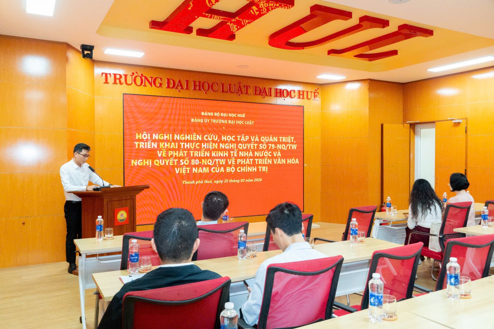 Ngày cập nhật: 25-02-2026Sáng 25/02/2026, Đảng uỷ Trường Đại học Luật, Đại học Huế tổ chức điểm cầu trực tuyến Hội nghị nghiên cứu, học tập, quán triệt và triển khai thực hiện Nghị quyết số 79-NQ/TW về phát triển kinh tế Nhà nước và Nghị quyết số 80-NQ/TW về phát triển văn hoá Việt Nam của Bộ Chính trị.