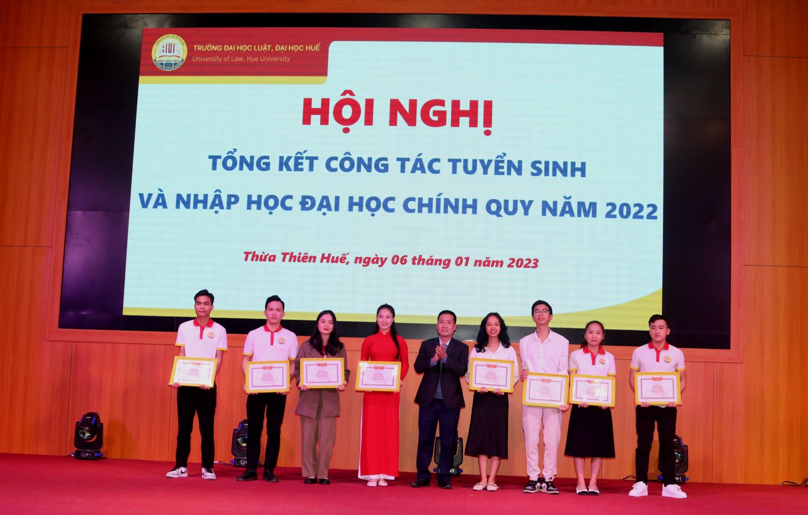 Nhân dip Hội nghị tổng kết Nhà trường tặng giấy khen cho 25 cá nhân và 07 tập thể đã có thành tích trong công tác tuyển sinh đại học hệ chính quy và kết nối nhập học năm 2022 của Trường Đại học Luật, Đại học Huế./.