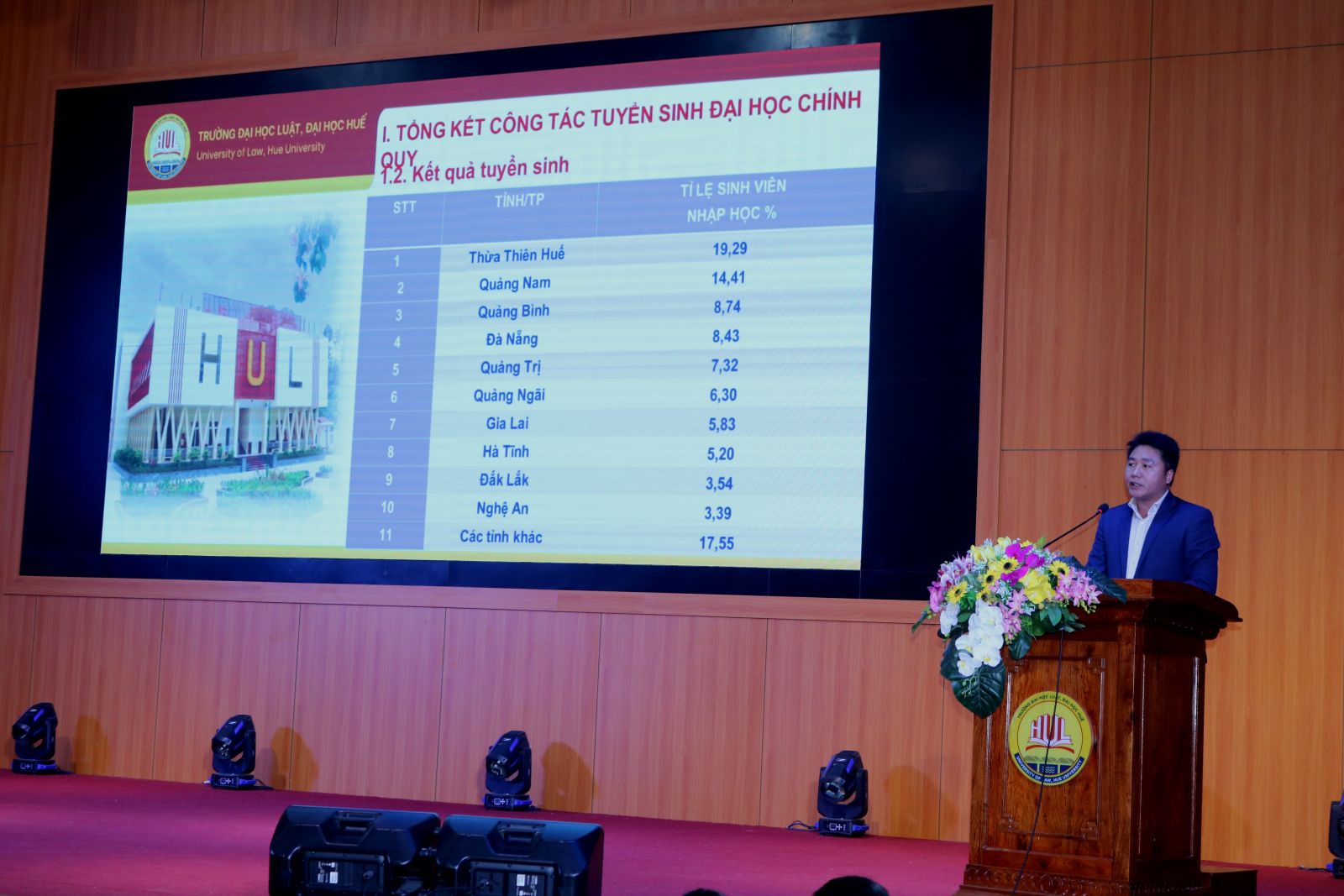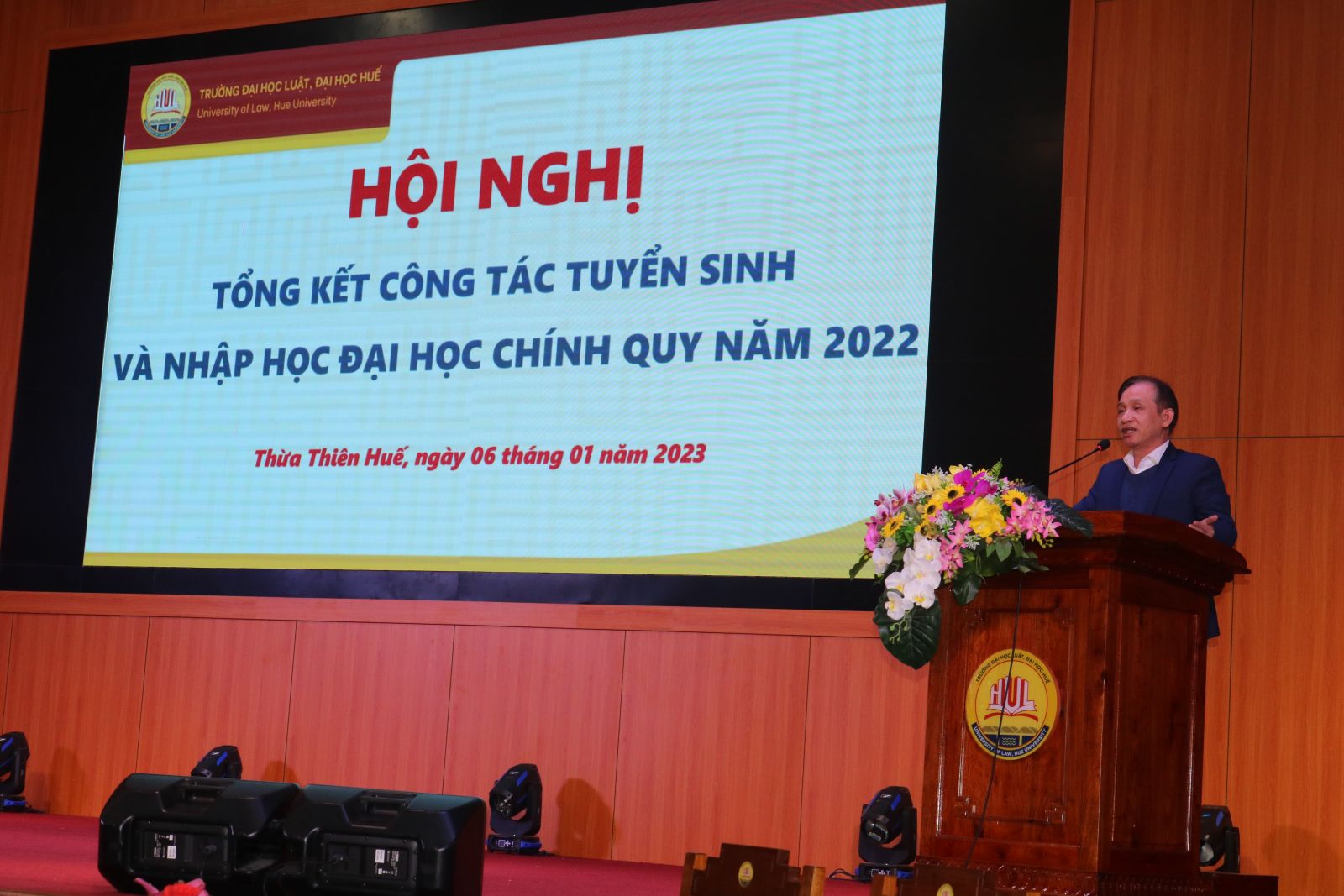 TS. Trần Viết Long, Trưởng phòng Đào tạo báo cáo kết quả công tác tuyển sinh của Nhà trường trong năm 2022 với những kết quả đã đạt được: Tuyển sinh dựa trên 03 phương thức: Xét tuyển học bạ (chiếm 47,24% tổng số sinh viên nhập học); Xét tuyển điểm thi TN THPT năm 2022 (chiếm 49,7% tổng số sinh viên nhập học); Xét tuyển thẳng (chiếm 3,06% tổng số sinh viên nhập học). Năm 2022, chỉ tiêu tuyển sinh Ngành Luật 500, Ngành Luật 400. Trường Đại học Luật đã tuyển sinh 1 đợt vượt chỉ tiêu đề ra đạt 108% so với tổng chỉ tiêu của năm 2022 (Các năm trước phải thực hiện tuyển sinh 2 đợt trở lên).
