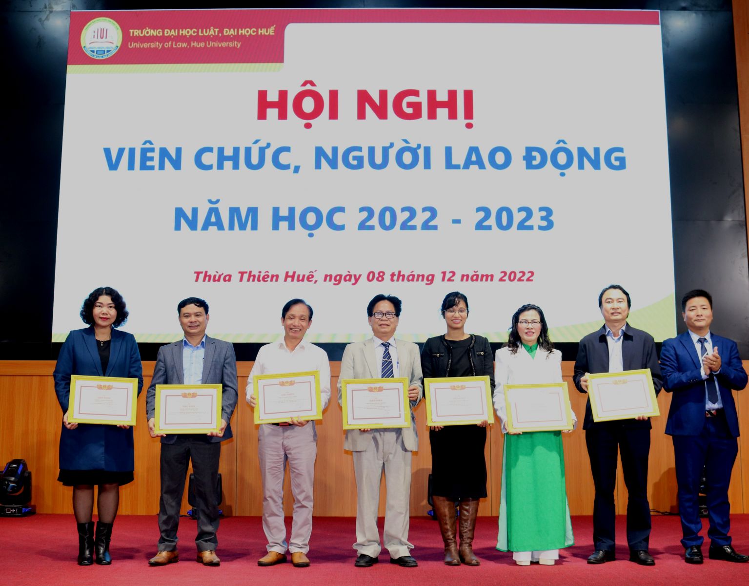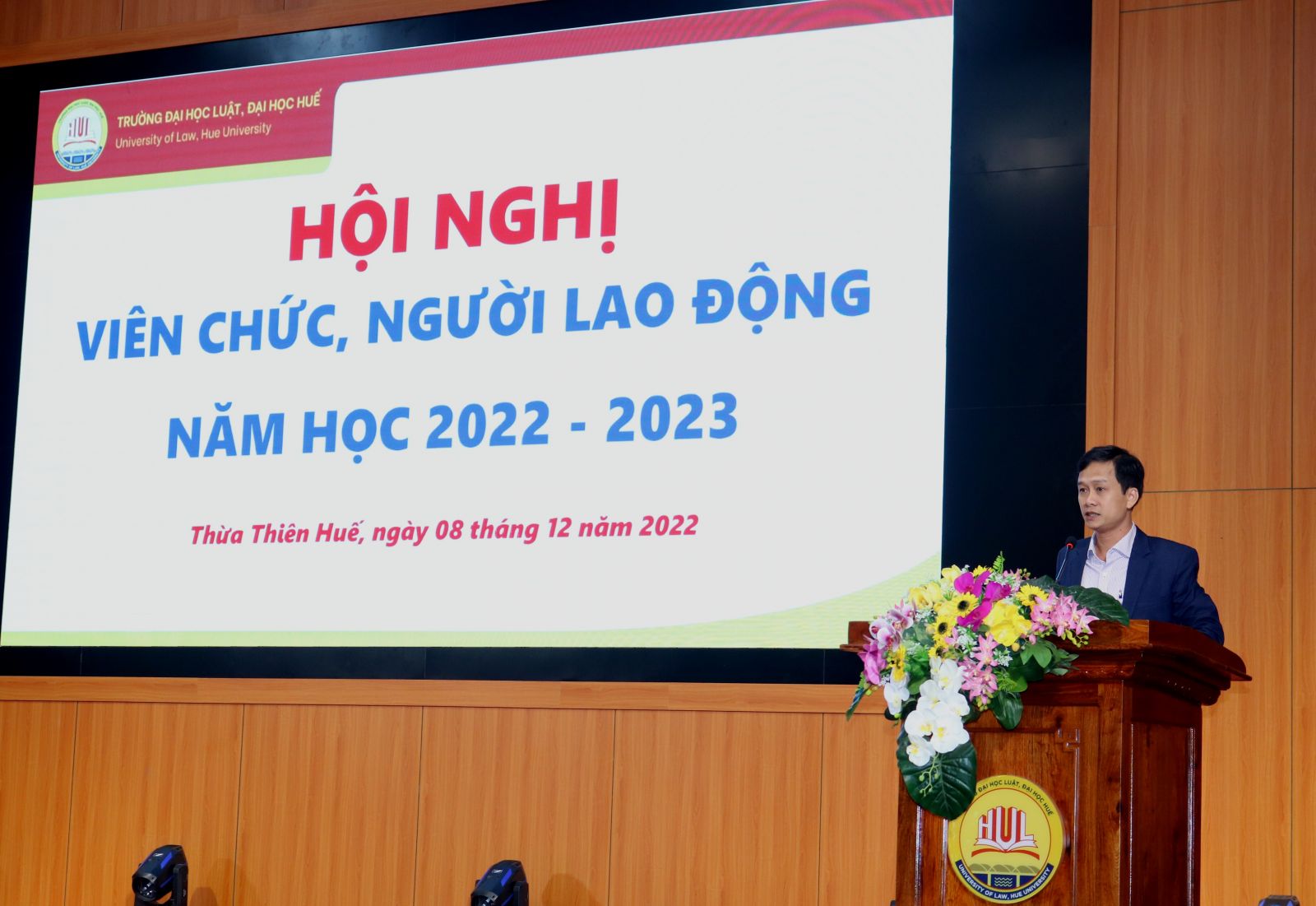 Ngày cập nhật: 12-12-2022Ngày 08/12/2022, Trường Đại học Luật, Đại học Huế tổ chức Hội nghị viên chức, người lao động năm học 2022-2023. Đến dự hội nghị, về phía Đại học Huế có TS. Bùi Văn Lợi, Phó Bí thư Đảng ủy, Phó Giám đốc Đại học Huế; PGS.TS. Nguyễn Duân, Chủ tịch Công đoàn Đại học Huế. Về phía Trường Đại học Luật có PGS.TS. Đoàn Đức Lương, Bí thư Đảng ủy, Hiệu trưởng; các đồng chí trong Đảng ủy, Ban Giám hiệu, Chủ tịch Công đoàn, Bí thư Đoàn thanh niên, Chủ tịch Hội CCB; Trưởng, phó các đơn vị trực thuộc cùng toàn thể viên chức và lao động Nhà trường.