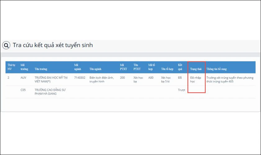 Tại mục tra cứu, hệ thống sẽ hiển thị các nguyện vọng đã đăng ký và kết quả trúng tuyển tương ứng. Những nguyện vọng có kết quả 'Trúng tuyển' sẽ được ghi chú rõ ràng.