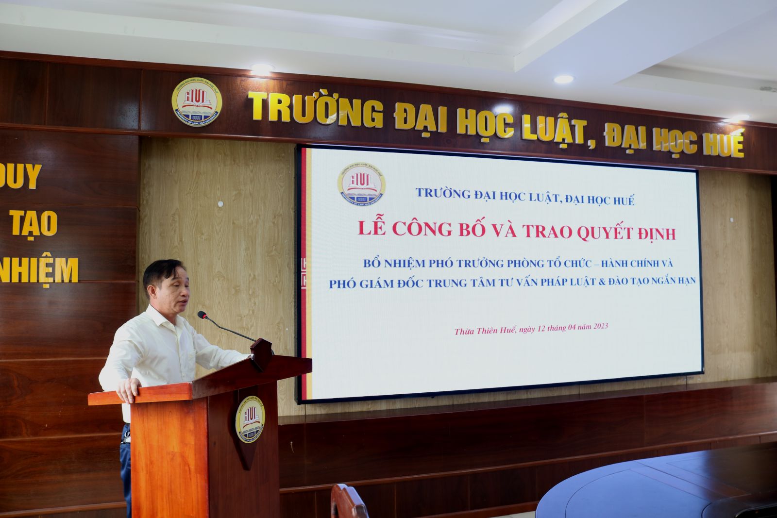 Ngày cập nhật: 13-04-2023Ngày 12/4/2023, Trường Đại học Luật, Đại học Huế tổ chức Lễ công bố quyết định bổ nhiệm bổ nhiệm Phó Trưởng phòng Tổ chức - hành chính và Phó Giám đốc Trung tâm Tư vấn pháp luật – Đào tạo ngắn hạn.
