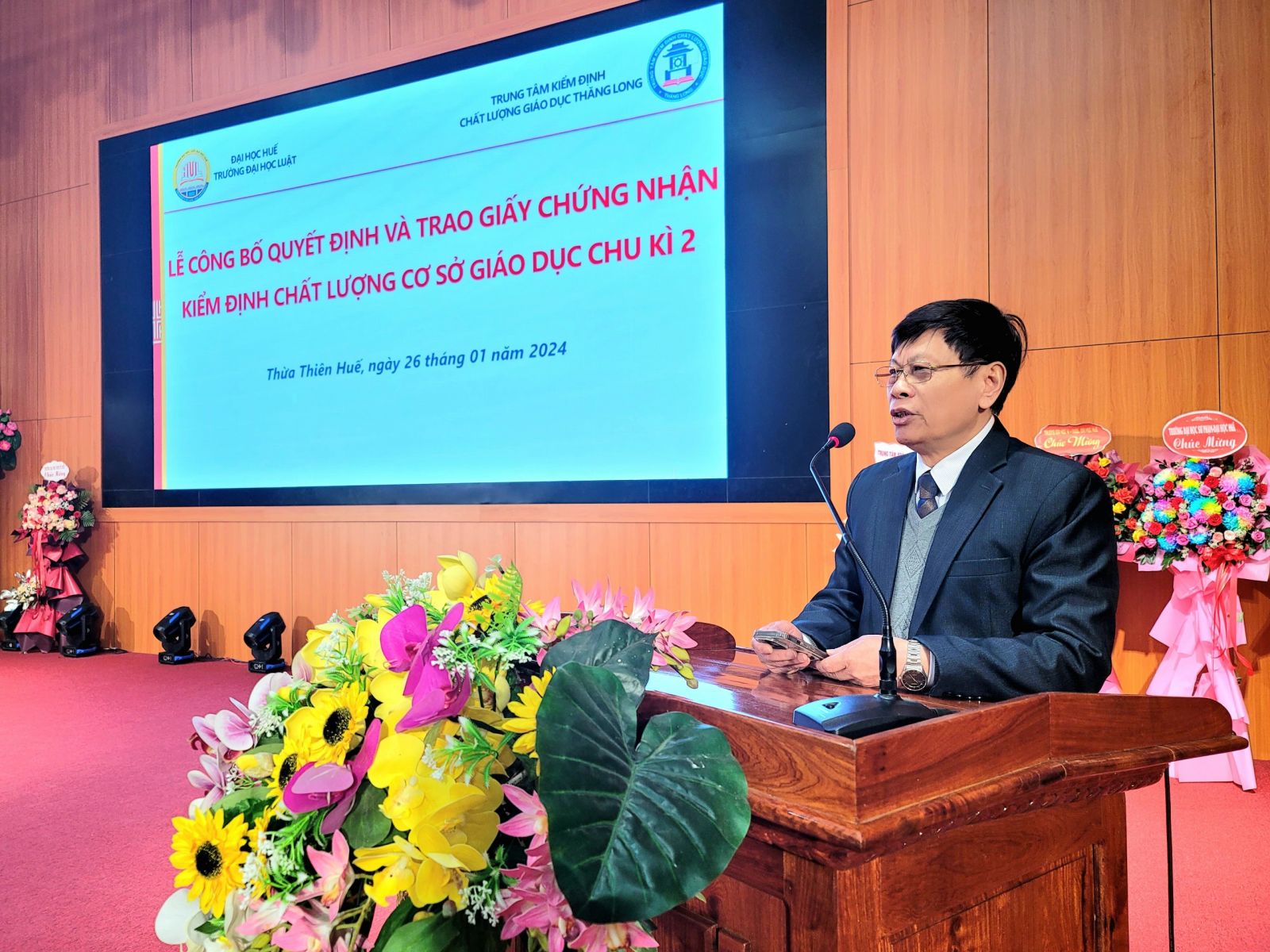 Thay mặt Trung tâm KĐCLGD Thăng Long, TS. Nguyễn Văn Đường gửi lời chúc mừng và đánh giá cao kết quả của Trường Đại học Luật, Đại học Huế trong hoạt động bảo đảm, kiểm định chất lượng giáo dục. Kết quả đạt được là cơ sở để giúp Nhà trường tiếp tục khẳng định chất lượng, vị thế, uy tín trong hệ thống giáo dục đại học Việt Nam.