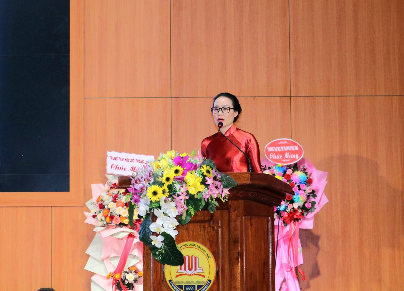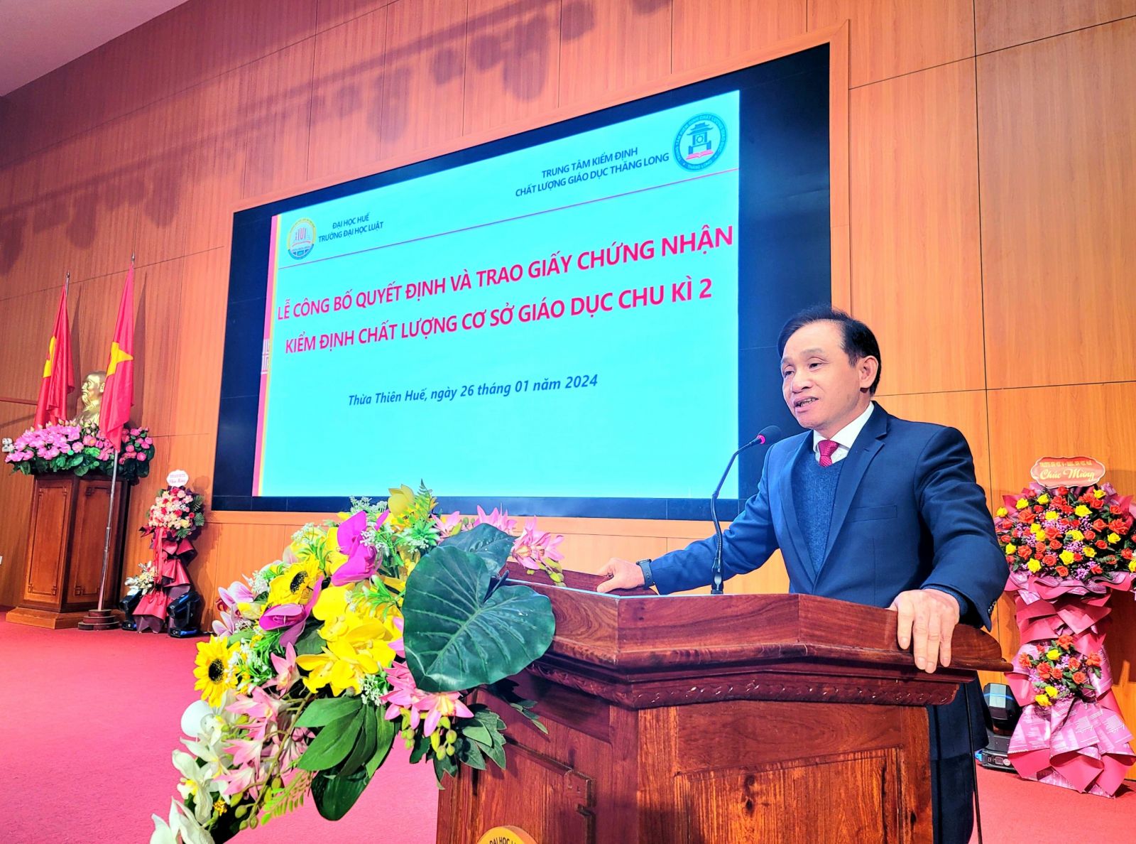 Phát biểu tại buổi lễ, PGS.TS. Đoàn Đức Lương, Bí thư Đảng uỷ, Hiệu trưởng Trường Đại học Luật, Đại học Huế bày tỏ niềm vui mừng khi đón nhận quyết định và giấy chứng nhận kiểm định chất lượng cơ sở giáo dục chu kỳ 2. PGS.TS. Đoàn Đức Lương khẳng định Chứng nhận kiểm định chất lượng không chỉ là minh chứng cho chất lượng đào tạo mà còn đem đến những cơ hội để cải tiến chất lượng các mặt hoạt động của Nhà trường. Đây sẽ là nền tảng, động lực để Nhà trường tiếp tục nâng cao chất lượng đào tạo đáp ứng yêu cầu của thị trường lao động và niềm tin của người học, xã hội. Đồng thời, Hiệu trưởng Nhà trường gửi lời cảm ơn sâu sắc đến Cục Quản lý chất lượng - Bộ Giáo dục và Đào tạo, Trung tâm KĐCLGD Thăng Long, sự chỉ đạo trực tiếp và giúp đỡ của lãnh đạo Đại học Huế; cùng tập thể cán bộ, giảng viên, học viên, sinh viên của Nhà trường đã luôn đồng hành, hỗ trợ, phối hợp thực hiện những nhiệm vụ quan trọng để Trường Đại học Luật, Đại học Huế đạt được chứng nhận chu kì 2 này.