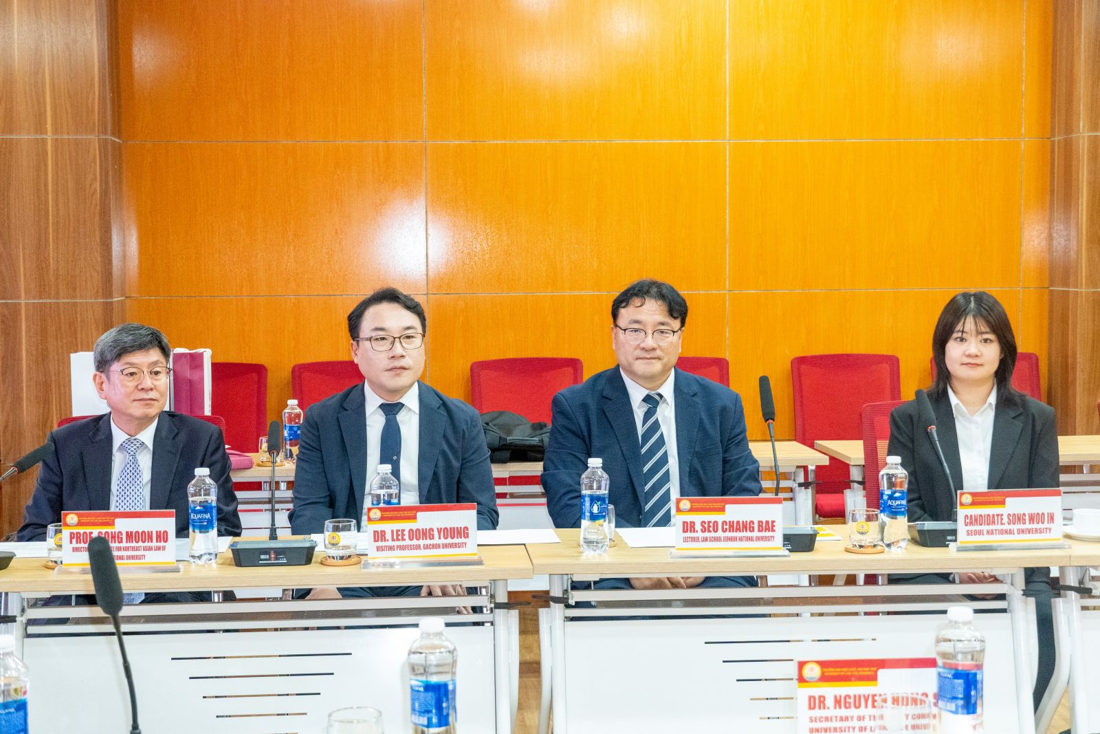 Về phía Viện Nghiên cứu Luật Đông Bắc Á, Trường Đại học Quốc gia Jeonbuk (Hàn Quốc) có GS. Song Moon Ho, Viện trưởng Viện Nghiên cứu Luật Đông Bắc Á, Trưởng khoa Trường Luật, Trường Đại học Quốc gia Jeonbuk; TS. Seo Chang Bae, Nghiên cứu viên toàn thời gian Viện Nghiên cứu Luật Đông Bắc Á, Giảng viên Trường Luật, Trường Đại học Quốc gia Jeonbuk; TS. Lee Oong Young, Nghiên cứu viên toàn thời gian Viện Nghiên cứu Luật Đông Bắc Á, Giáo sư thỉnh giảng Trường Đại học Gachon; NCS. Song Woo In, Nghiên cứu viên Viện Nghiên cứu Chính sách Phụ nữ Hàn Quốc, Trợ giảng Trường Đại học Quốc gia Seoul.