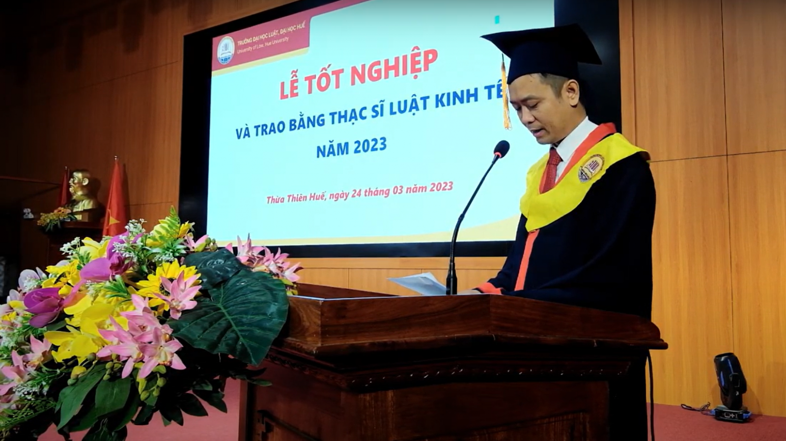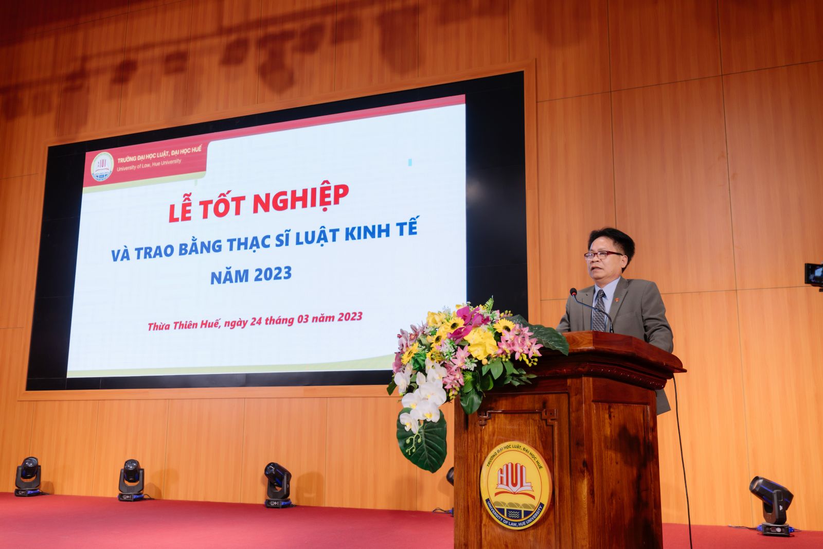 PGS.TS. Nguyễn Duy Phương căn dặn: các anh chị tân thạc sĩ sau khi trở về cơ quan, đơn vị công tác, luôn luôn phát huy những kiến thức, những tri thức bậc cao mà mình đã học tập, nghiên cứu, tích lũy được từ môi trường giảng đường sau đại học để tiếp tục cống hiến, phục vụ cơ quan, đơn vị, quê hương, đất nước được tốt hơn. Về Trường Đại học Luật, Đại học Huế, chúng tôi tin tưởng và mong rằng, các tân thạc sĩ về cơ quan, địa phương công tác, tiếp tục phối hợp và hỗ trợ cho Trường các hoạt động gắn với đào tạo, nghiên cứu khoa học, tạo điều kiện thực tập, thực tế cho sinh viên; đóng góp ý kiến về chương trình đào tạo, về mục tiêu phát triển và hệ thống các kỹ năng; kết nối học viên các khóa trong ban liên lạc cựu học viên để tạo thành mạng lưới cựu sinh viên, cựu học viên của Trường Đại học Luật, Đại học Huế trong cả nước theo tiến trình lịch sử xây dựng và phát triển của Nhà trường.