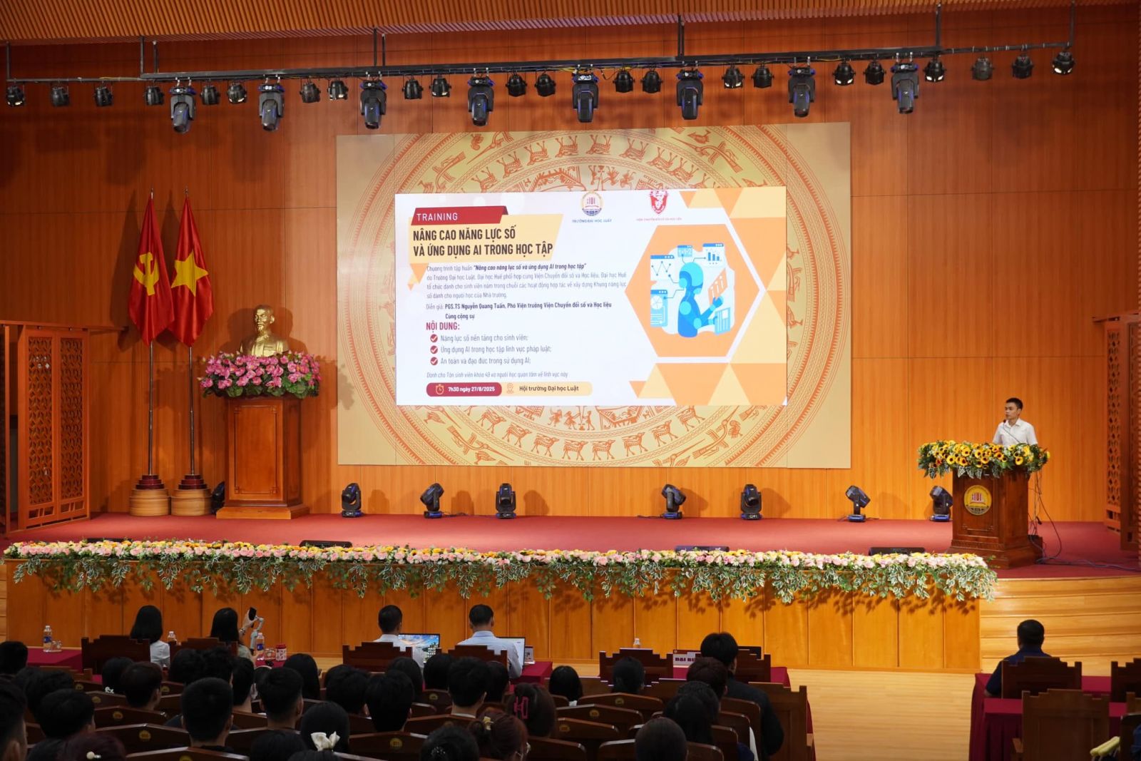 Ngày cập nhật: 27-08-2025Sáng ngày 27/8/2025, Trường Đại học Luật, Đại học Huế phối hợp với Viện Chuyển đổi số và Học liệu, Đại học Huế tổ chức chương trình tập huấn “Nâng cao năng lực số và Ứng dụng AI trong học tập” dành cho các tân sinh viên K49 nhập học đợt 1.