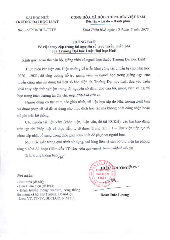 Thông báo về việc truy cập sử dụng trang tài nguyên số miễn phí của Trường Đại học Luật