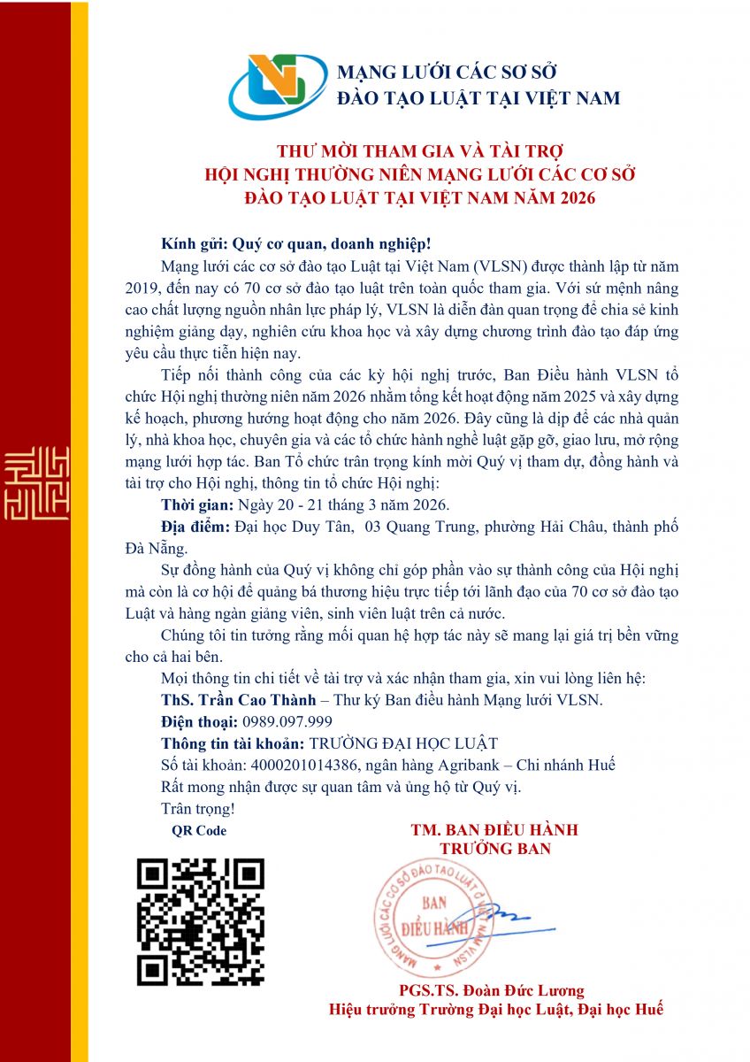 Thư ngỏ tham gia và tài trợ Hội nghị Thường niên Mạng lưới các cơ sở đào tạo Luật tại Việt Nam năm 2026