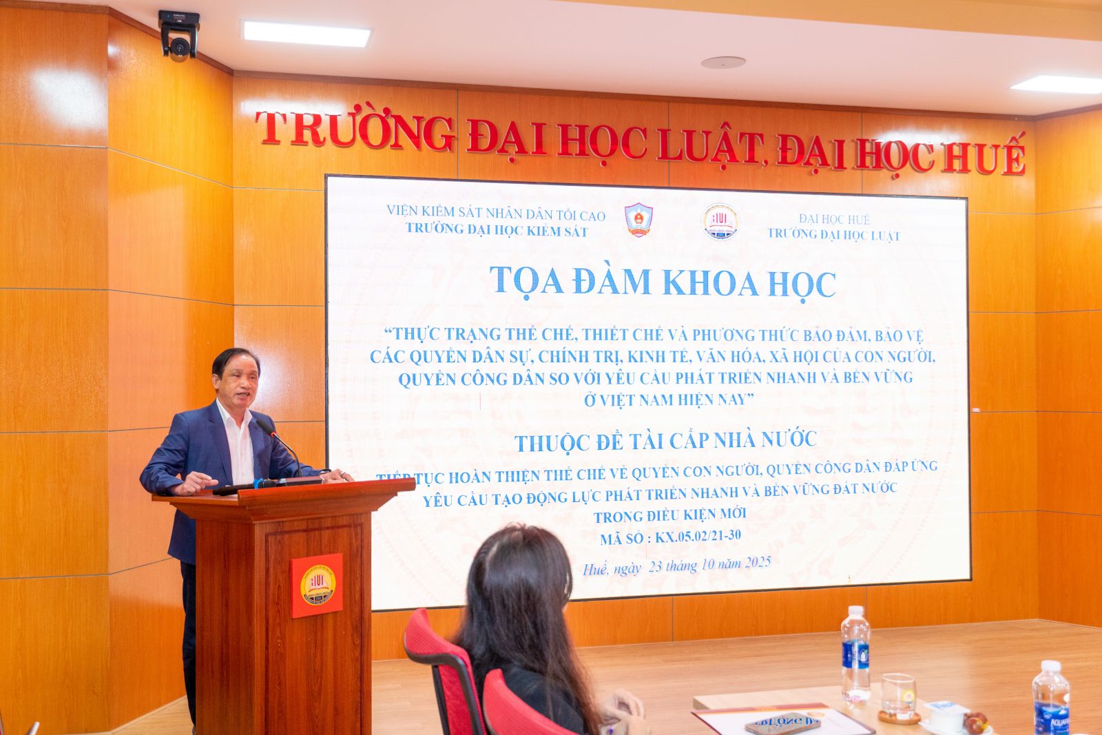 PGS.TS. Đoàn Đức Lương bày tỏ vinh dự khi Trường Đại học Luật, Đại học Huế là đơn vị đồng tổ chức sự kiện có ý nghĩa học thuật và thực tiễn sâu sắc này. Thầy cho rằng, tọa đàm không chỉ góp phần thúc đẩy hoạt động nghiên cứu, đào tạo trong lĩnh vực pháp luật, mà còn tạo cơ hội kết nối tri thức, chia sẻ kinh nghiệm giữa các nhà nghiên cứu, nhà quản lý và giới thực hành pháp lý cùng hướng tới mục tiêu xây dựng và củng cố Nhà nước pháp quyền xã hội chủ nghĩa Việt Nam.