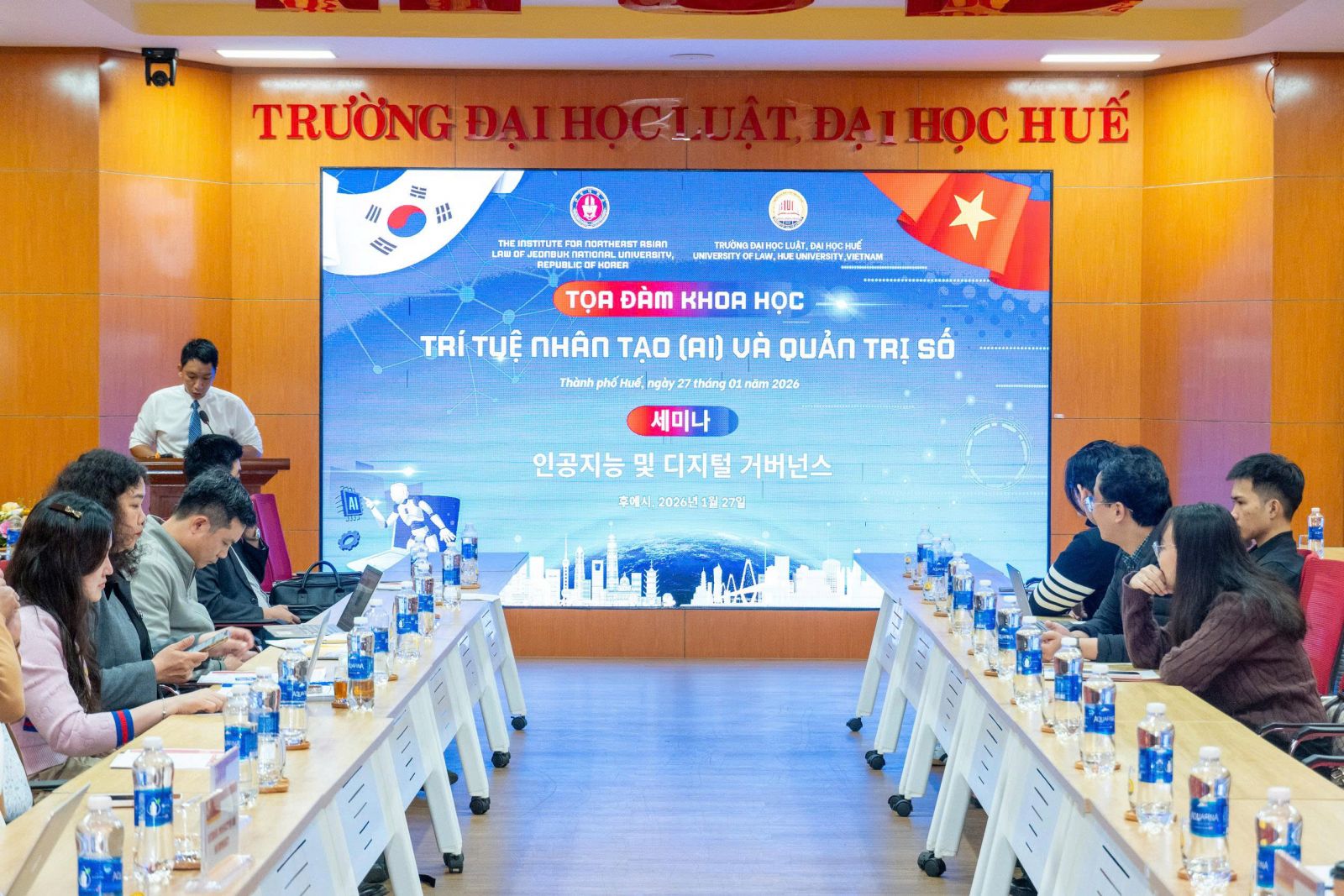 Ngày cập nhật: 28-01-2026Chiều ngày 27/01/2026, Trường Đại học Luật, Đại học Huế phối hợp với Viện Nghiên cứu Luật Đông Bắc Á, Trường Đại học Quốc gia Jeonbuk (Hàn Quốc) tổ chức Toạ đàm khoa học với chủ đề “Trí tuệ nhân tạo (AI) và quản trị số”. Hội thảo là hoạt động học thuật có ý nghĩa thiết thực, góp phần tăng cường trao đổi khoa học quốc tế, đồng thời làm rõ những vấn đề pháp lý đặt ra trong bối cảnh chuyển đổi số và sự phát triển nhanh chóng của trí tuệ nhân tạo.