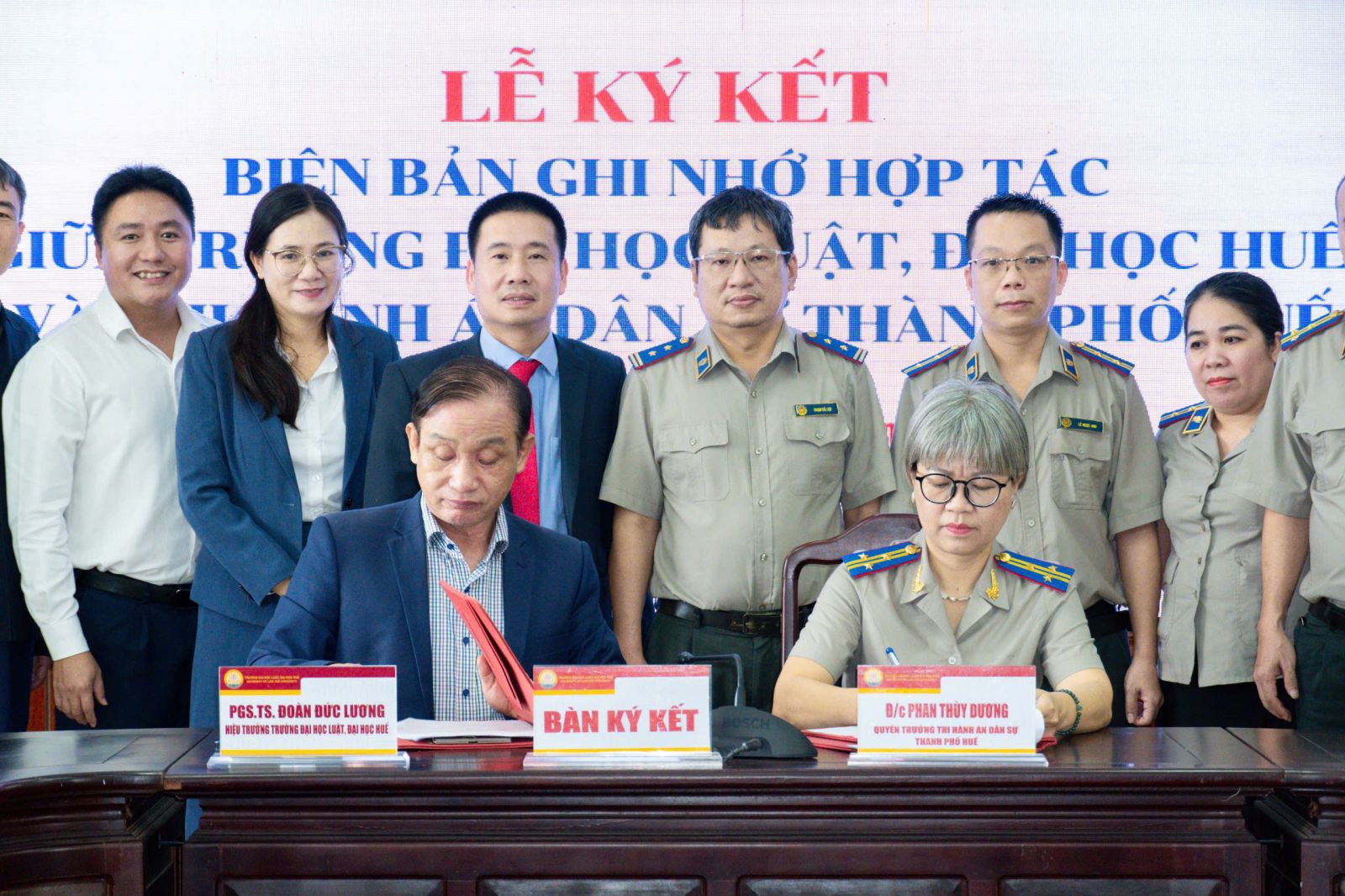 Về phía Trường Đại học Luật, Đại học Huế, có PGS.TS. Đoàn Đức Lương, Hiệu trưởng; TS. Nguyễn Hồng Sơn, Chủ tịch Hội đồng Trường cùng lãnh đạo các đơn vị trực thuộc.