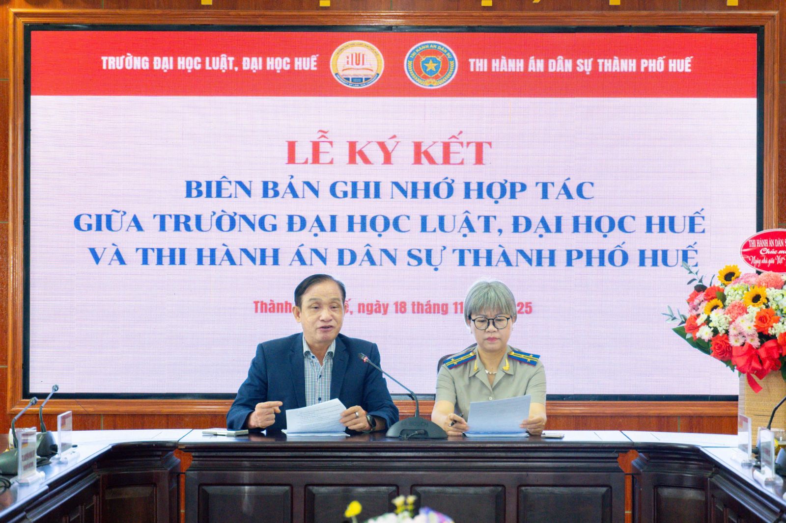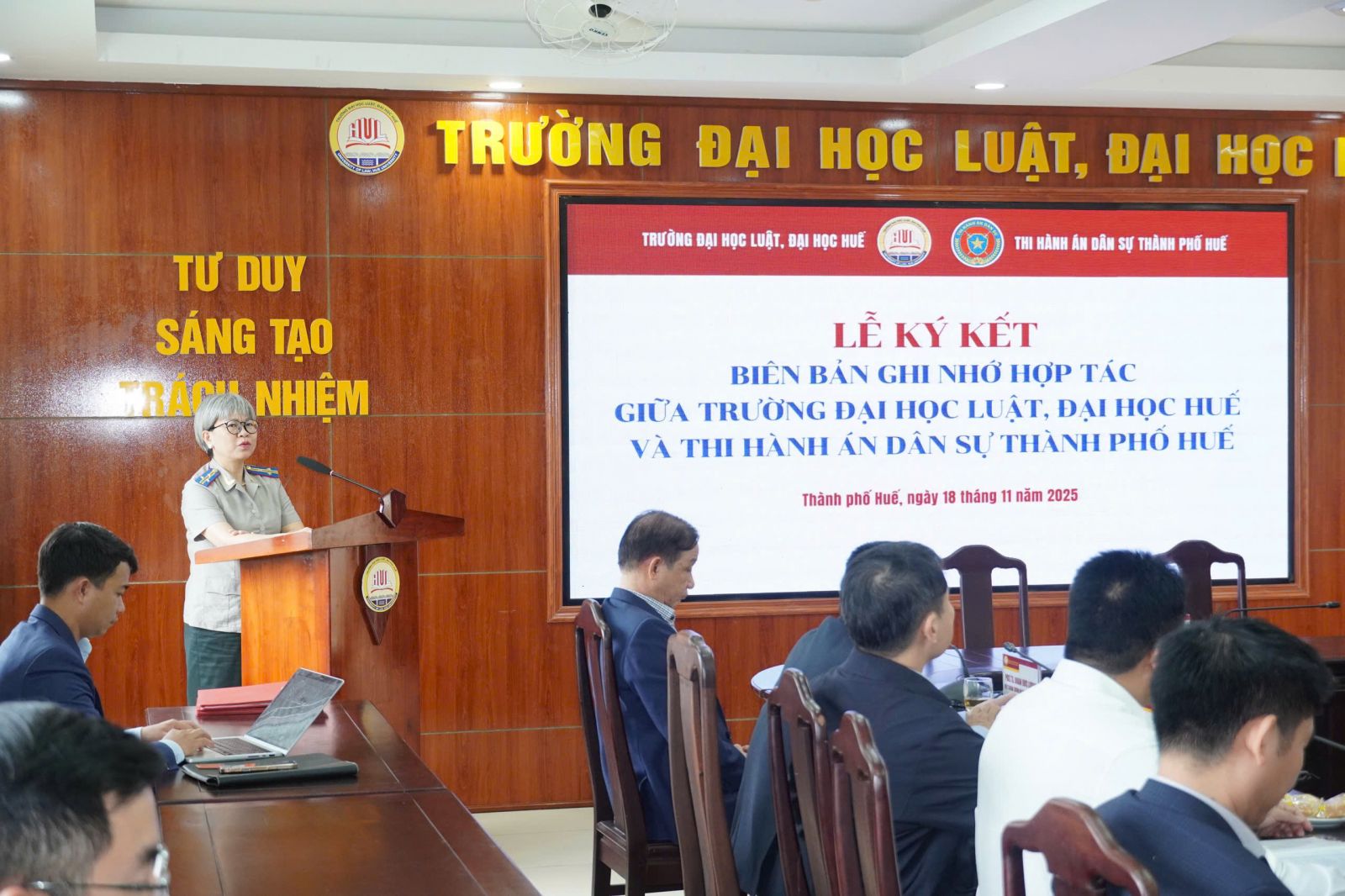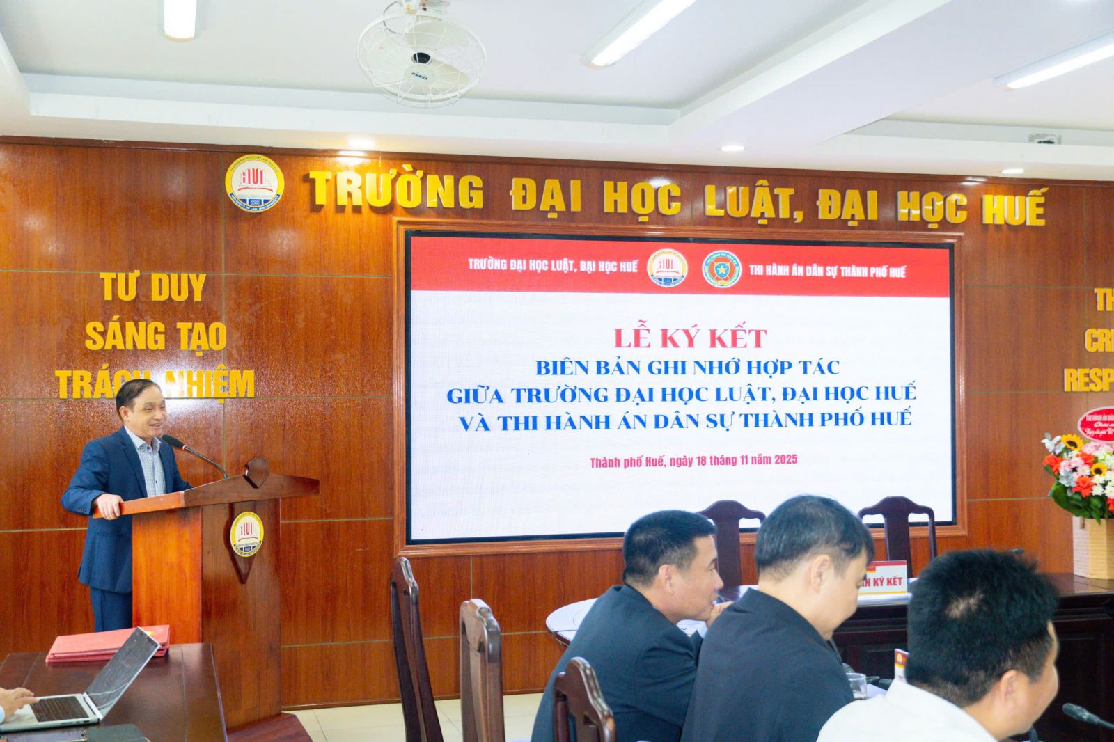 Đại diện Thi hành án dân sự thành phố Huế, đồng chí Phan Thuỳ Dương phát biểu:“Trong bối cảnh yêu cầu cải cách tư pháp và nâng cao chất lượng nguồn nhân lực pháp luật, sự phối hợp giữa cơ quan thi hành án và nhà trường sẽ mang lại lợi ích thiết thực cho cả hai bên. Cơ quan Thi hành án dân sự sẵn sàng tạo điều kiện để sinh viên tham gia thực tập, nghiên cứu cũng như tiếp cận các quy trình nghiệp vụ một cách bài bản, thực tế.”