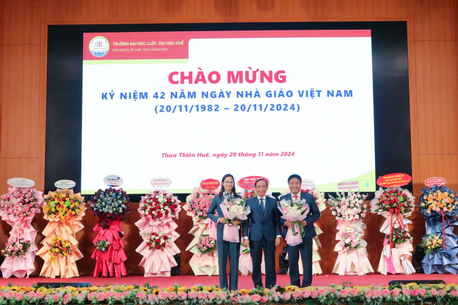 Tại buổi lễ, Nhà trường đã vinh danh 02 tân Phó Giáo sư (PGS.TS. Trần Viết Long, Trưởng Phòng Đào tạo và PGS.TS. Nguyễn Thị Hồng Trinh, Trưởng khoa Luật Quốc tế); tân Tiến sĩ Phan Vĩnh Tuấn Anh, giảng viên khoa Luật Quốc tế.