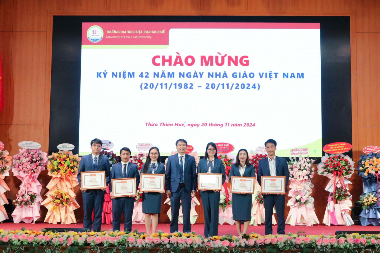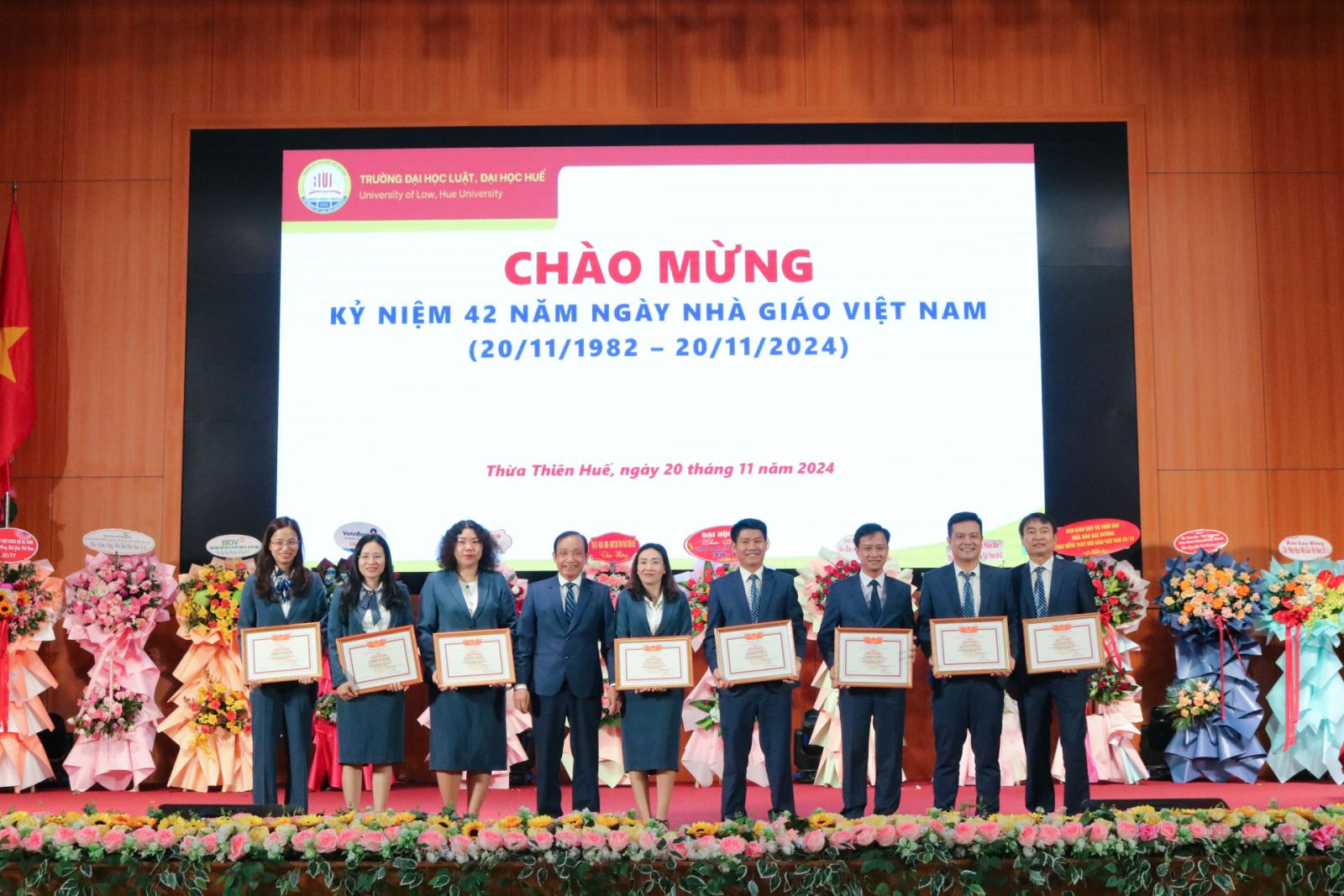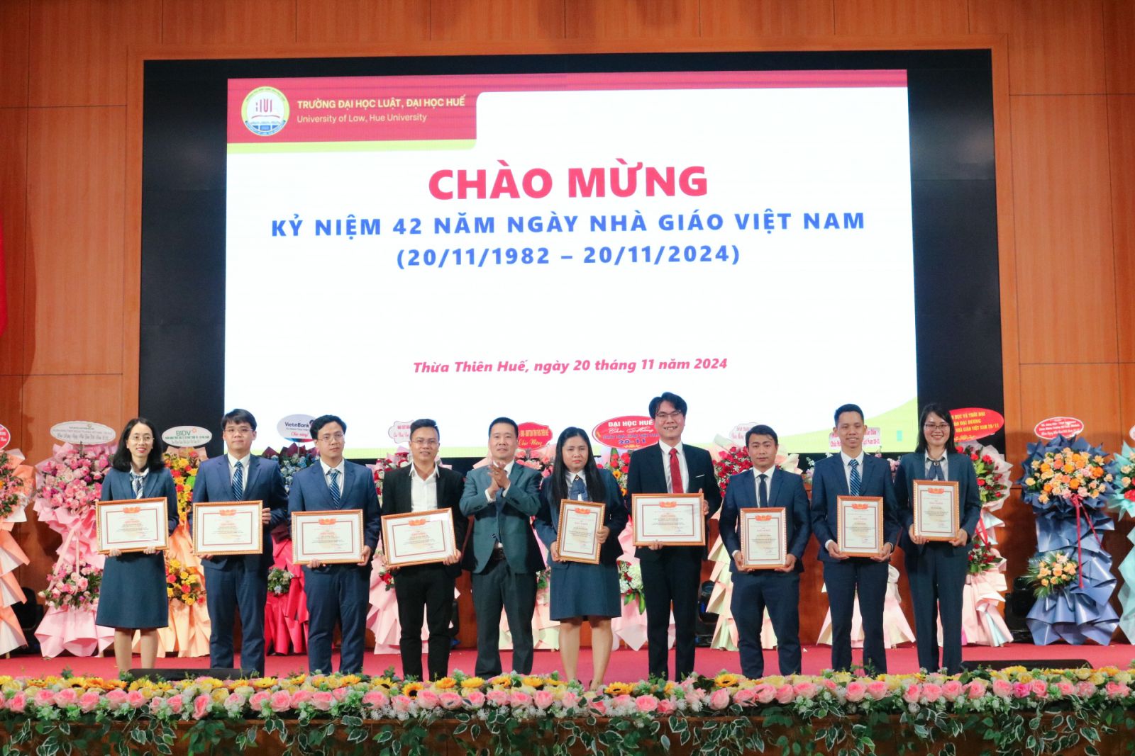 Cũng trong dịp này, Nhà trường quyết định khen thưởng 10 VCLĐ và GV có thành tích cao trong Nghiên cứu khoa học; 09 GV có thành tích xuất sắc trong hướng dẫn sinh viên NCKH đạt giải cấp ĐHH và Ban huấn luyện sinh viên tham gia cuộc thi Hoà giải Thương mại Việt Nam (V-med) năm 2024; 10 GV là ban huấn luyện Cuộc thi sinh viên Sáng tạo và Quyền sở hữu trí tuệ, Cuộc thi Tài năng nghề Luật năm 2024.