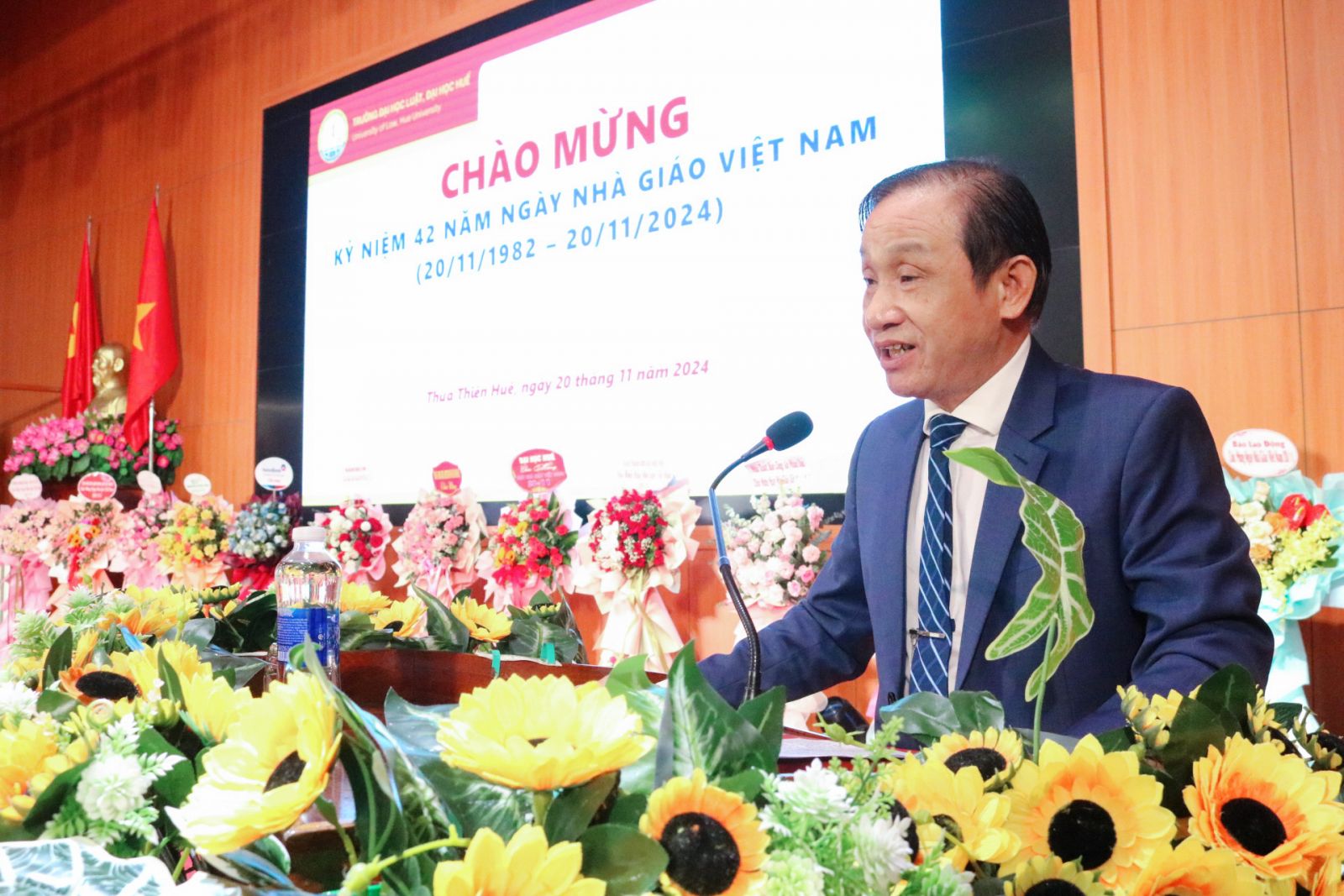 Thay mặt Nhà trường, PGS.TS. Đoàn Đức Lương, Bí thư Đảng uỷ, Hiệu trưởng Nhà trường gửi lời cảm ơn đến quý thầy cô, lãnh đạo Trường qua các thời kỳ đã dày công xây đắp, chung sức, đồng lòng tạo nên Trường Đại học Luật, ĐH Huế vững mạnh như ngày hôm nay. Đồng thời kính chúc các thầy cô giáo mạnh khoẻ và luôn là tấm gương về đạo đức, tâm huyết, sáng tạo để tập thể giảng viên, viên chức, người lao động Trường Đại học Luật, ĐH Huế noi gương.