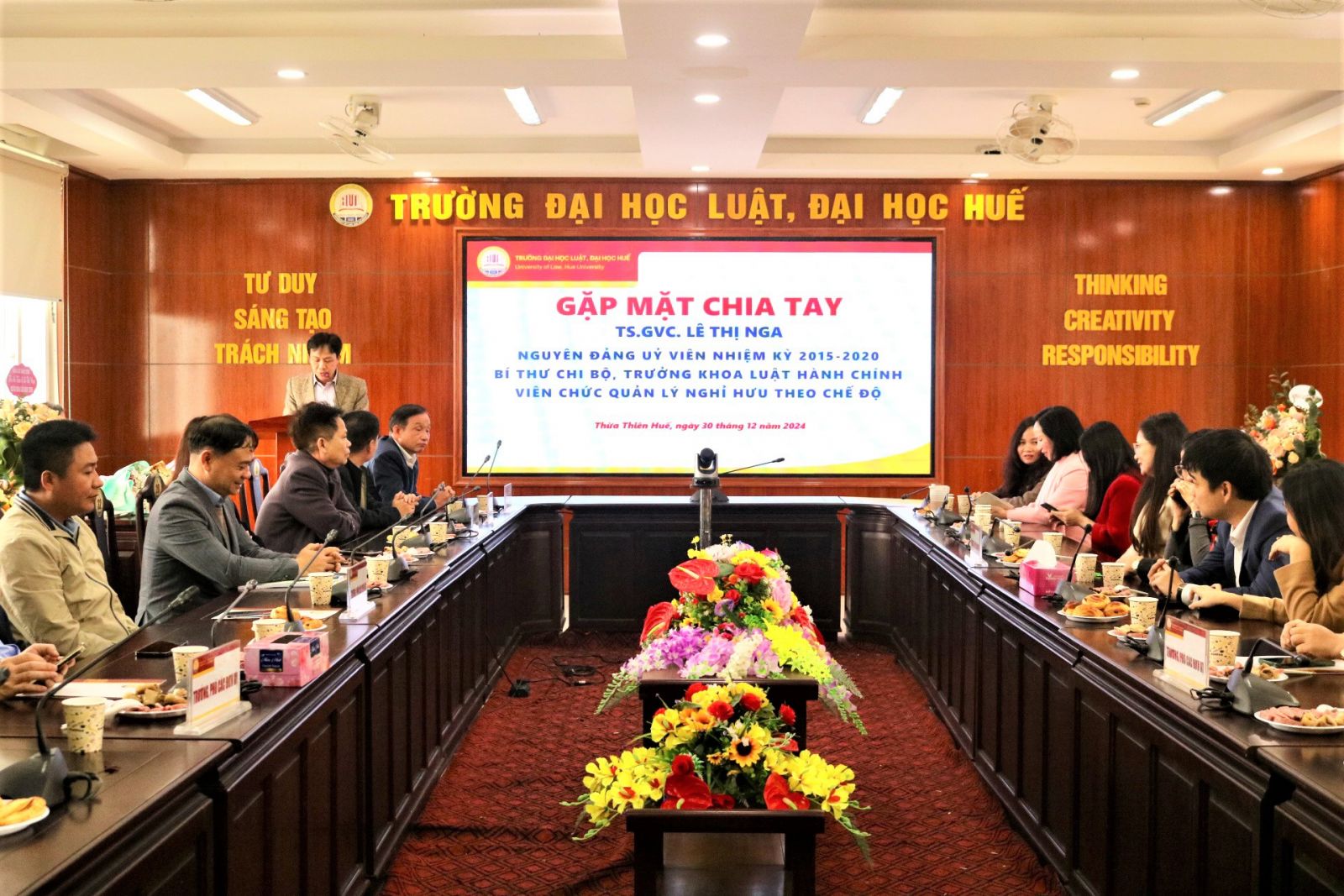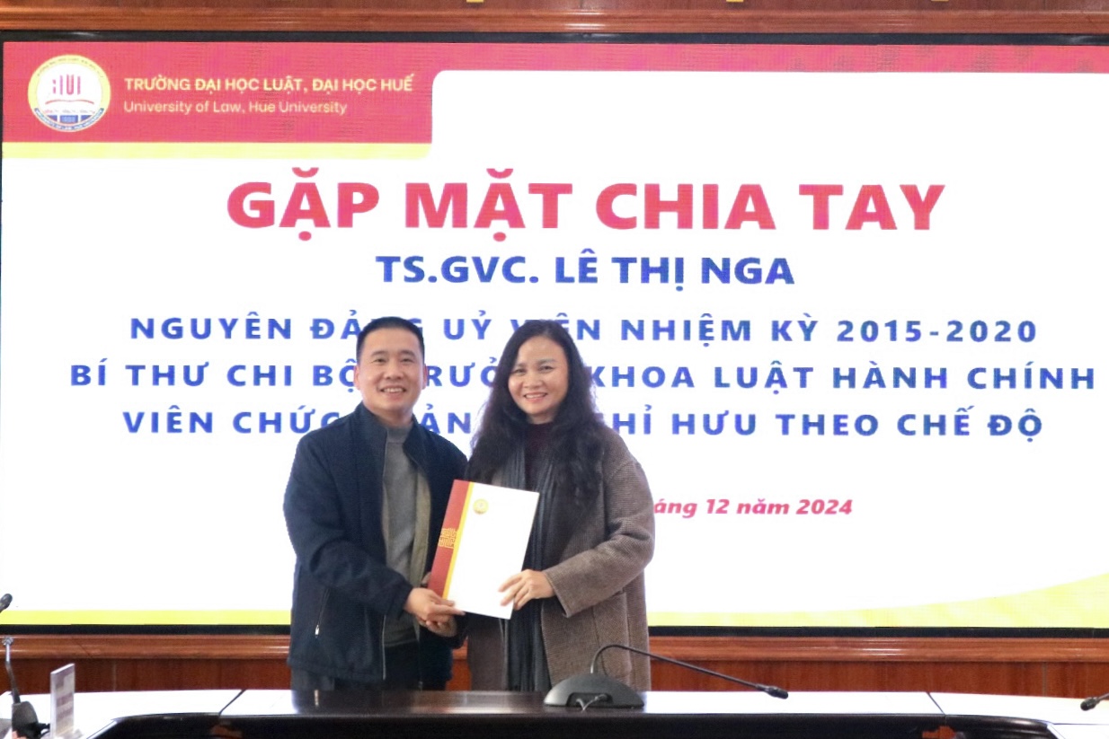 Ngày cập nhật: 30-12-2024Sáng ngày 30/12/2024, tại Trường Đại học Luật, Đại học Huế đã diễn ra lễ chia tay TS.GVC. Lê Thị Nga, nguyên Đảng uỷ viên nhiệm kỳ 2015-2020, Bí thư Chi bộ, Trưởng khoa Luật Hành chính nghỉ hưu theo chế độ.