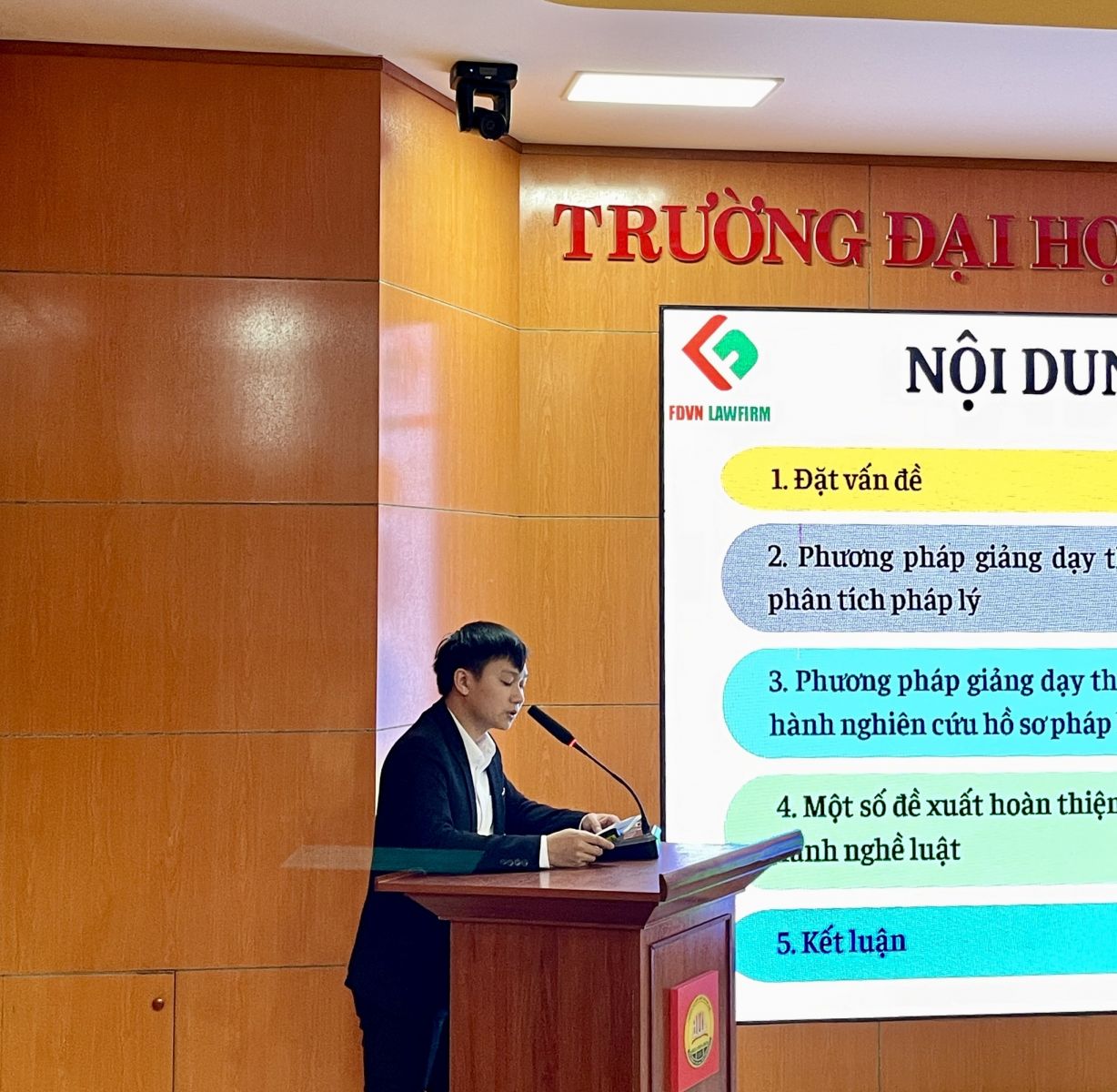 Hình ảnh LS. Trần Văn Hương, thành viên Công ty Luật FDVN trình bày báo cáo tại Hội thảo khoa học Dân sự năm 2025
