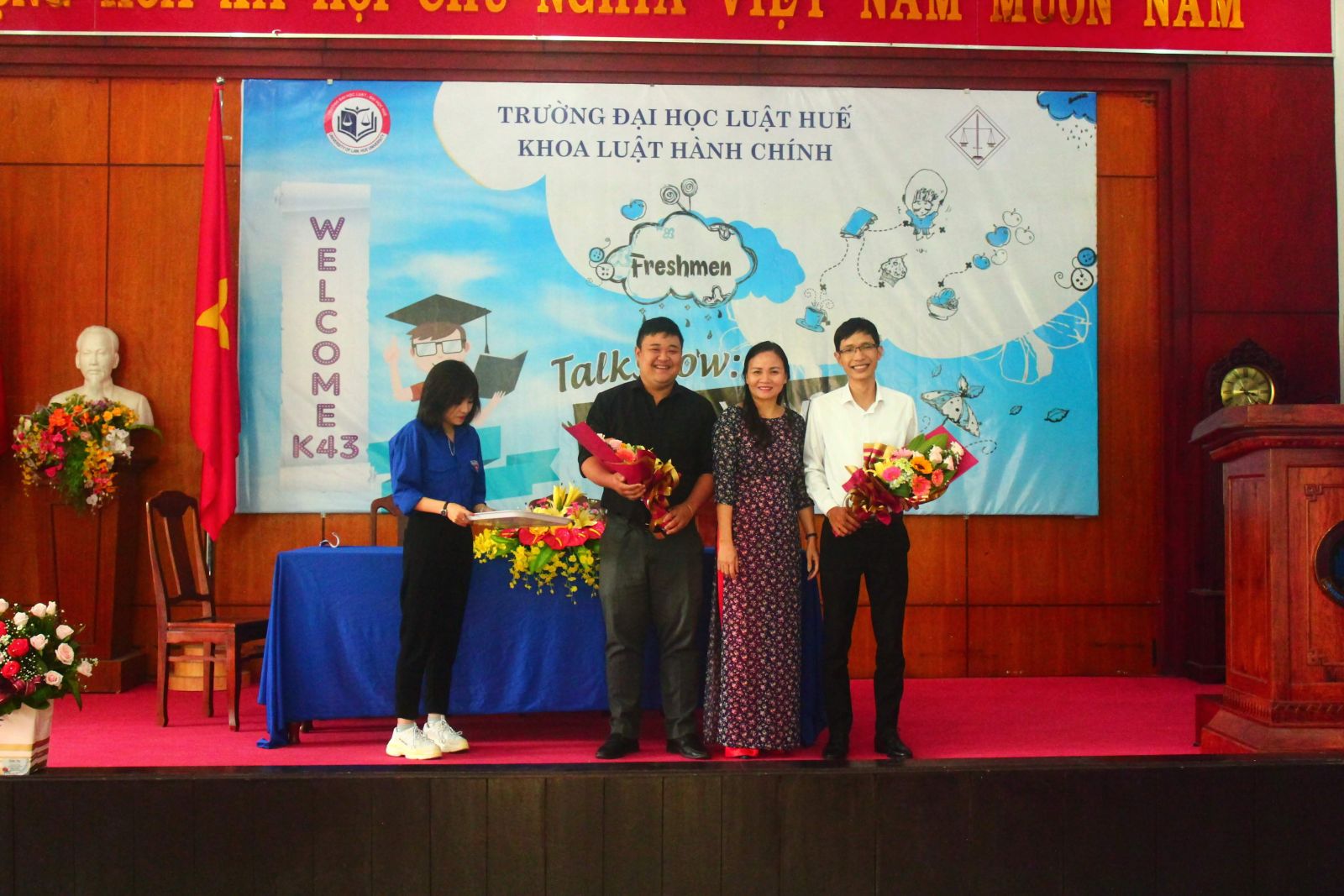 Ngoài ra, chương trình Talkshow cũng lắng nghe những chia sẻ đầy bỡ ngỡ và xúc động của 3 bạn Tân sinh viên đại diện cho Khóa K43 của Khoa Luật Hành chính khi các bạn trải lòng về những trải nghiệm đầu tiên khi đặt chân đến Huế và những mong ước và kỳ vọng của các bạn trên con đường mới mẻ tại mái trường Đại học. Đồng thời, Nhằm ghi nhận thành tích xuất sắc và tuyên dương thủ khoa đầu vào của Khoa, TS. Lê Thị Nga đã đại diện Khoa luật Hành Chính trao những phần quà chúc mừng cho bạn tân sinh viên đạt điểm số cao nhất trong kỳ thi tuyển đầu vào của khóa K43 khoa luật Hành Chính.