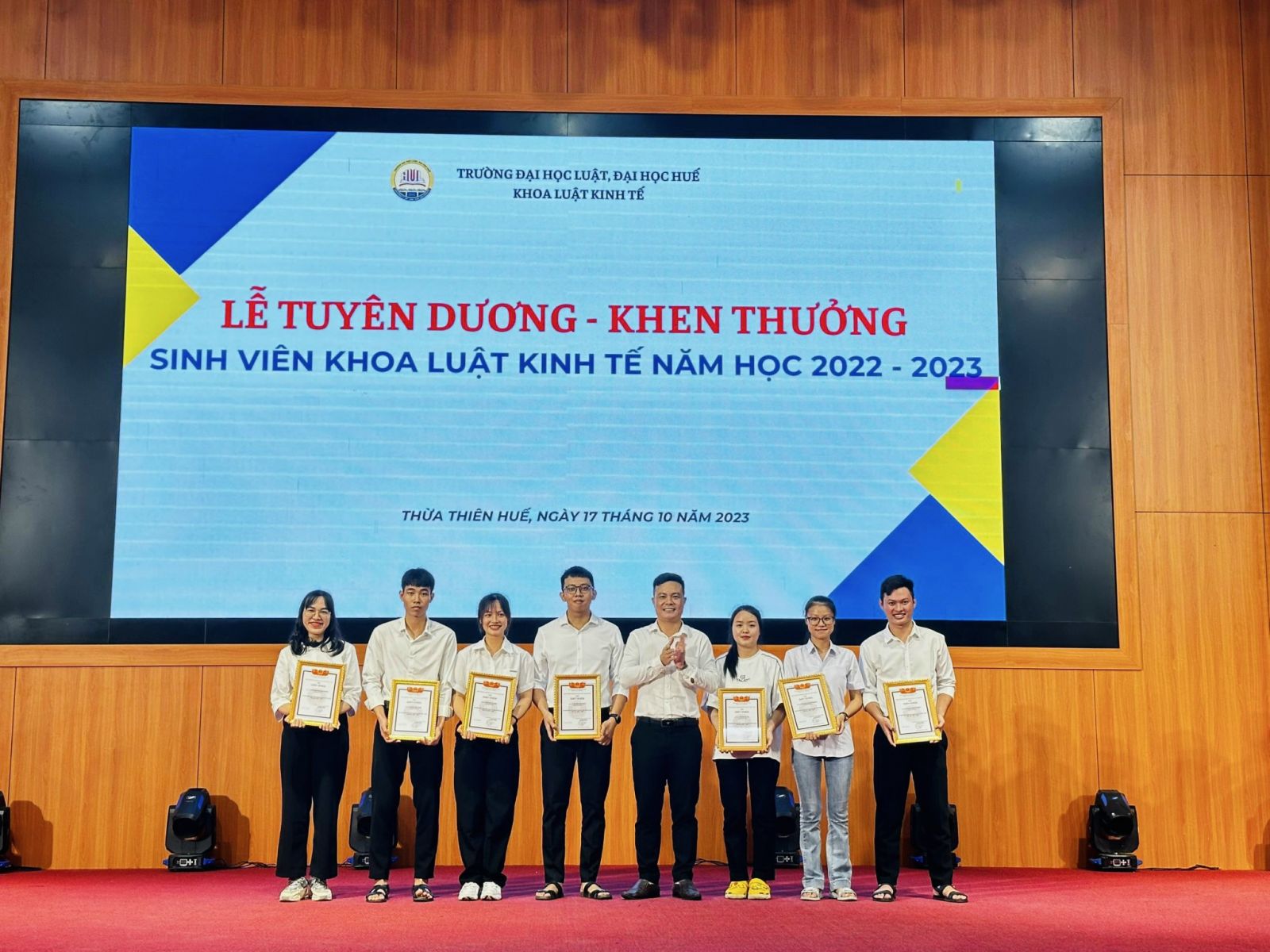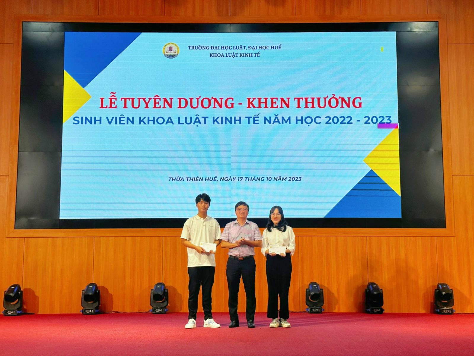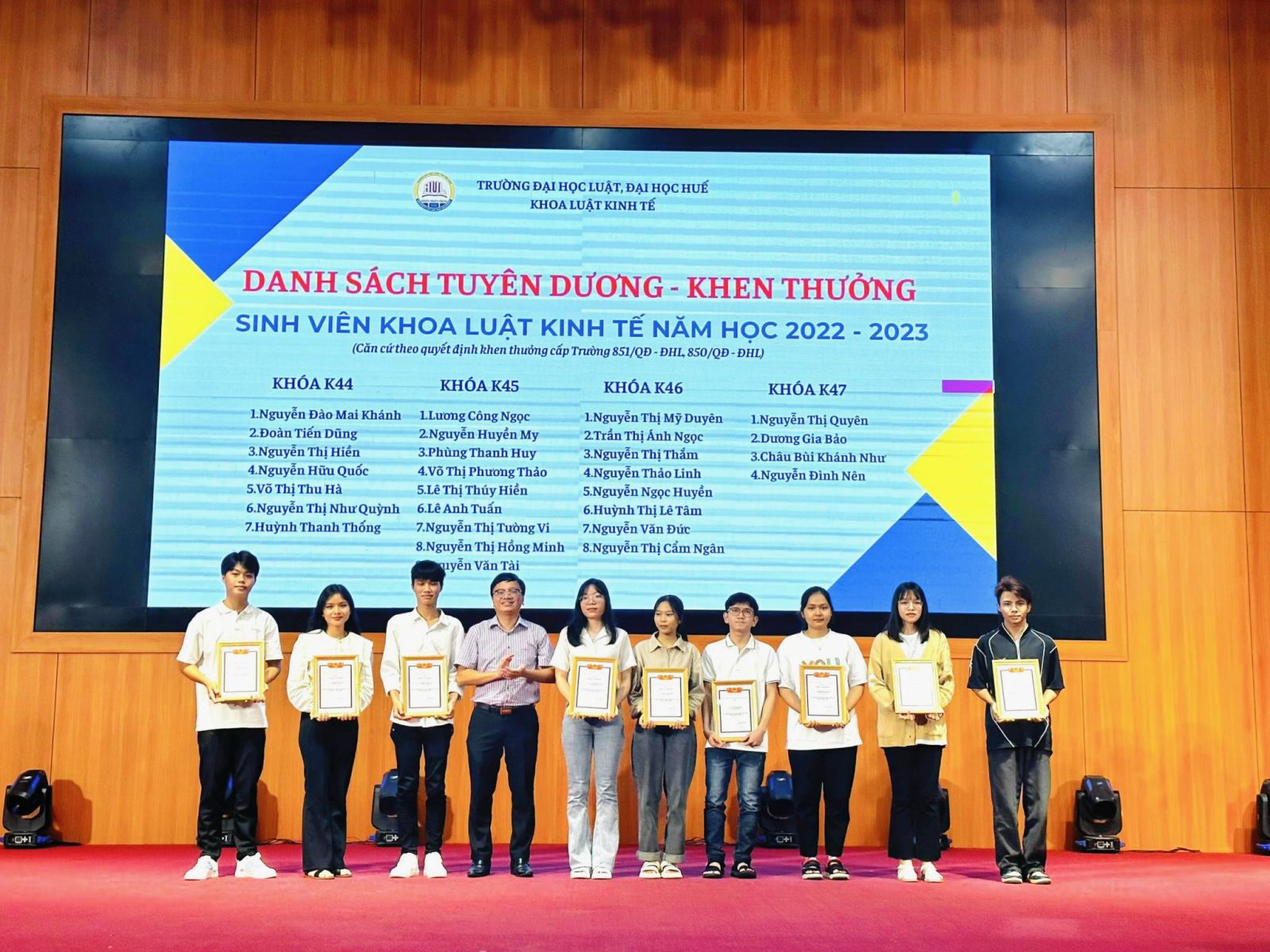 Cuối cùng là phần tổ chức trao tặng giấy khen và các phần thưởng cho các bạn sinh viên có thành tích xuất sắc, cao trong năm học 2022-2023. Thay mặt Ban Chủ nhiệm Khoa Luật Kinh tế, ThS. Ngô Hữu Phúc đọc Quyết định khen thưởng cấp Trường 851/QĐ - ĐHL về việc tặng giấy khen cho sinh viên đạt thành tích xuất sắc, sinh viên đạt thành tích cao trong học tập vè rèn luyện năm học 2022 - 2023. Quyết định 850/QĐ - ĐHL về sinh viên có thành tích cao trong tuyển sinh đại học năm 2023. Khen thưởng cấp khoa cho sinh viên khoa Luật kinh tế đạt điểm học tập và rèn luyện cao toàn khoá và sinh viên trúng tuyển cao nhất.