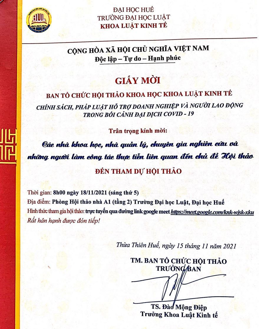Thư mời tham dự hội thảo khoa học cấp khoa với chủ đề “chính sách, pháp luật, hỗ trợ doanh nghiệp và người lao động trong bối cảnh đại dịch covid-19”