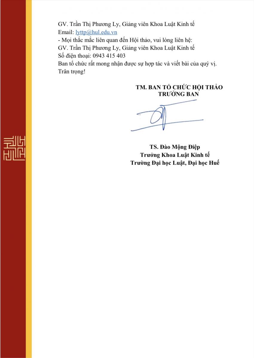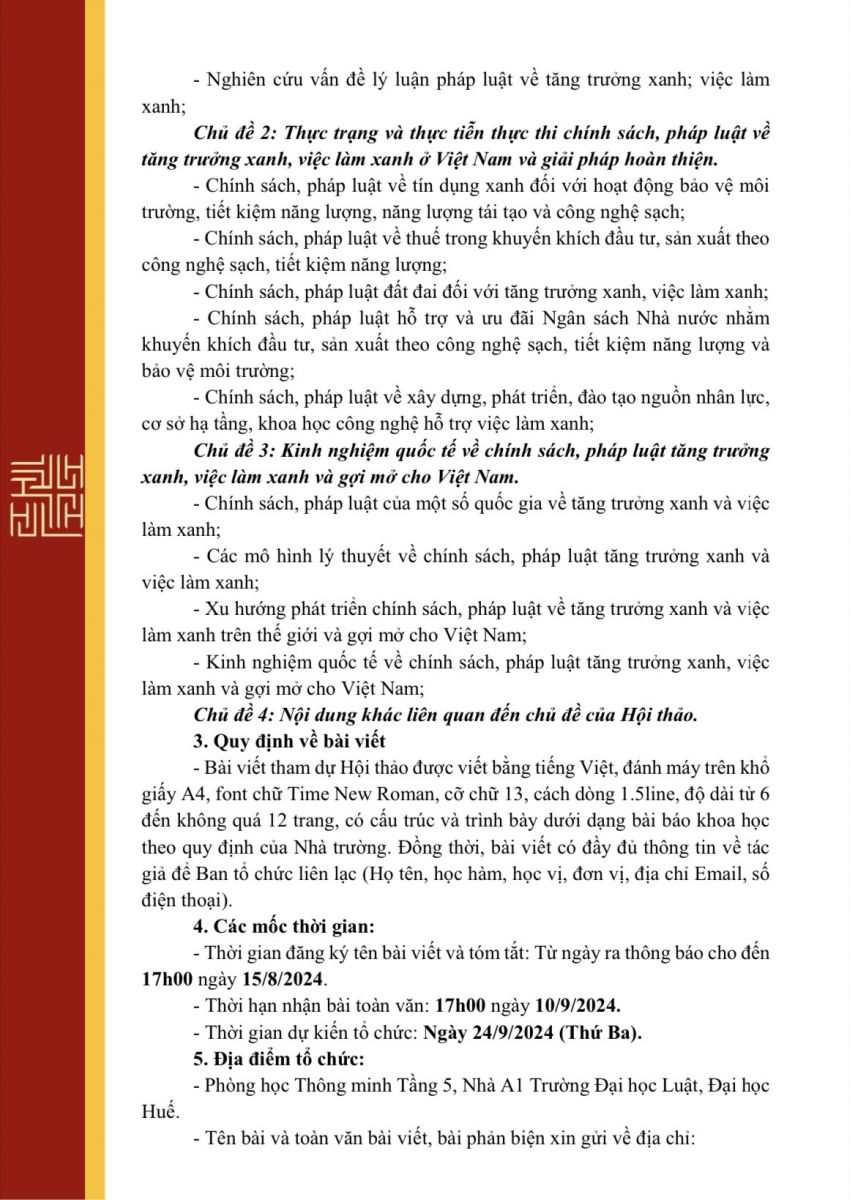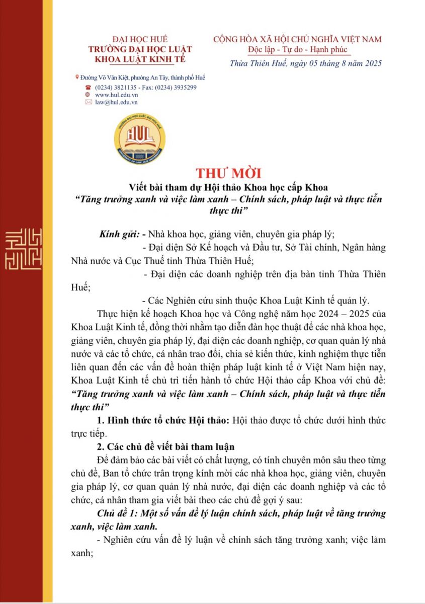 THƯ MỜI VIẾT BÀI THAM DỰ HỘI THẢO KHOA HỌC CẤP KHOA VỚI CHỦ ĐỀ "TĂNG TRƯỞNG XANH VÀ VIỆC LÀM XANH - CHÍNH SÁCH, PHÁP LUẬT VÀ THỰC TIỄN THỰC THI"