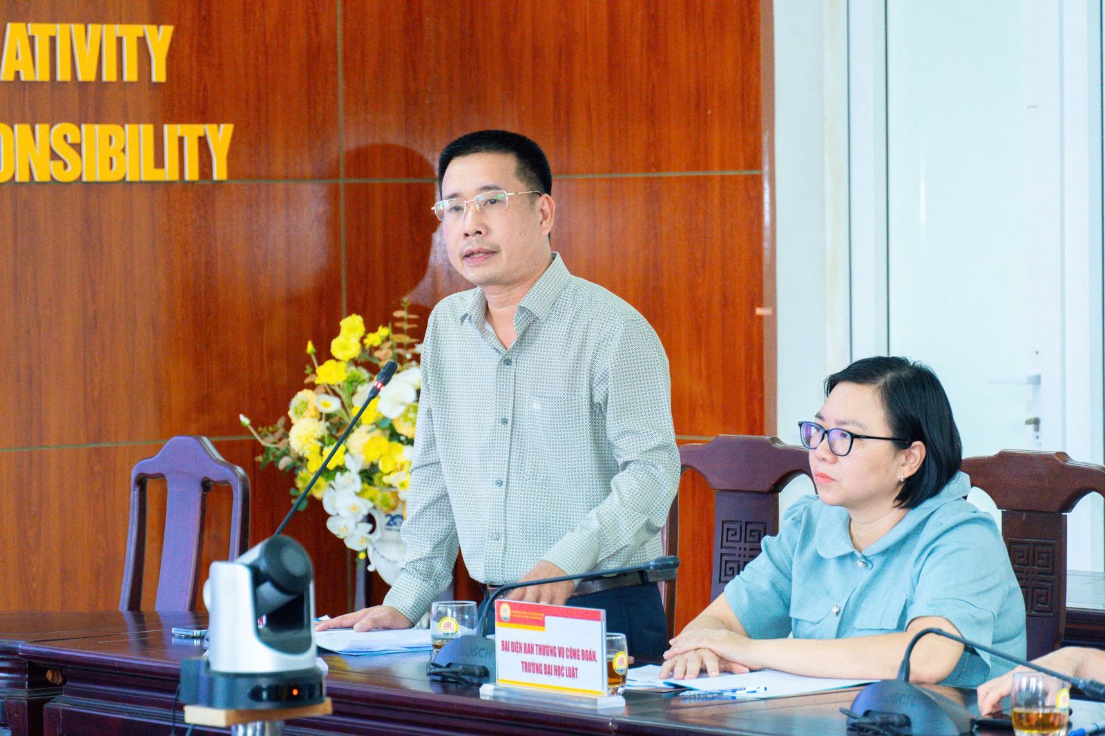Đến tham dự hội nghị có đại diện Ban giám hiệu nhà trường TS. Nguyễn Hồng Sơn, Chủ tịch Hội đồng trường Đại học Luật; Đại diện Công đoàn ThS. Đặng Thị Duyên, Ban Chấp hành Công đoàn; Th.S Nguyễn Trung Kiên, Trưởng phòng CTSV; Cùng toàn thể viên chức, người lao động phòng Công tác sinh viên tham dự.