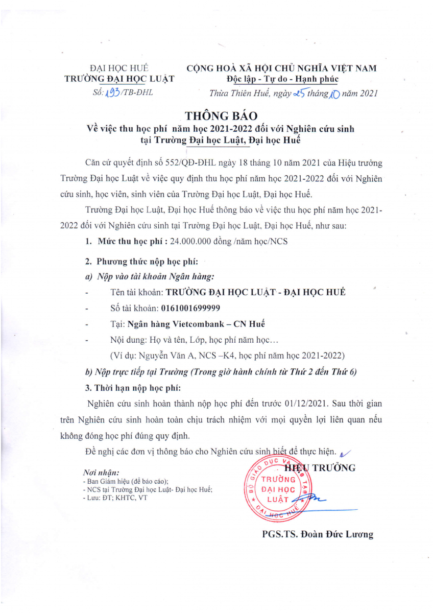 Thông báo về việc thu học phí năm học 2021-2022 đối với Nghiên cứu sinh tại Trường Đại học Luật, Đại học Huế