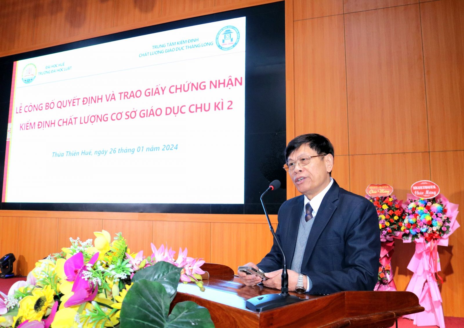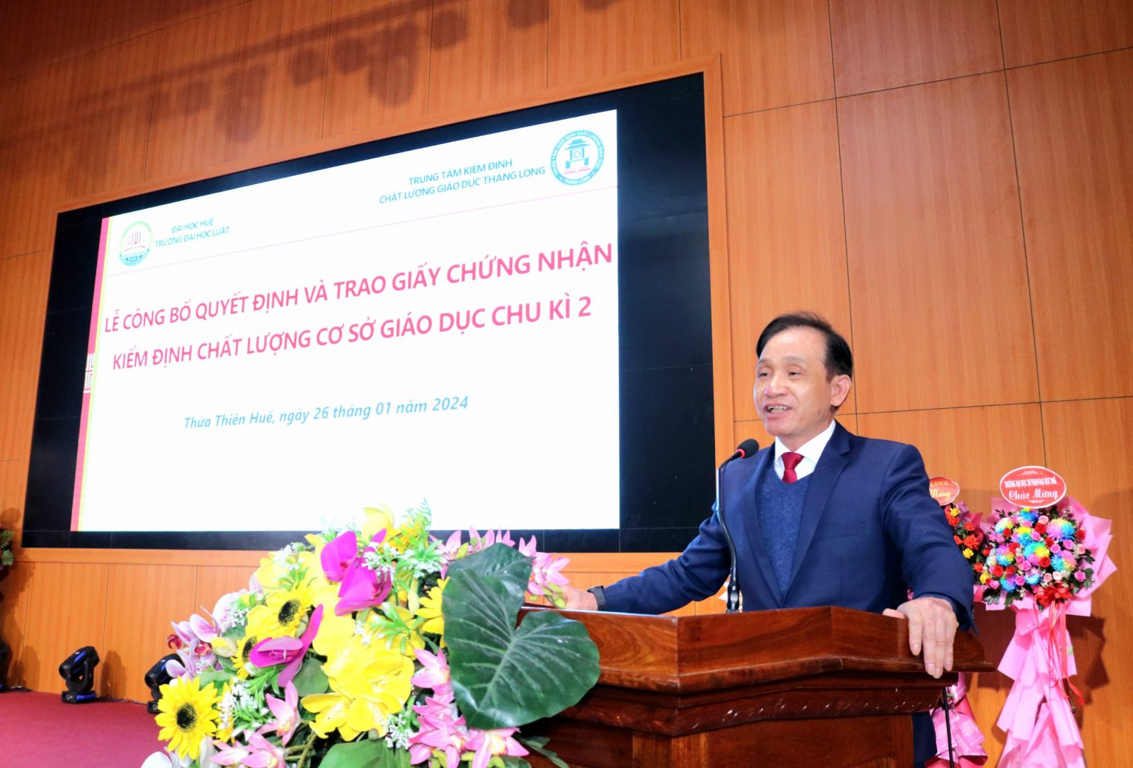 Thay mặt Trung tâm KĐCLGD Thăng Long, TS. Nguyễn Văn Đường gửi lời chúc mừng và đánh giá cao kết quả của Trường Đại học Luật, Đại học Huế trong hoạt động bảo đảm, kiểm định chất lượng giáo dục. Kết quả đạt được là cơ sở để giúp Nhà trường tiếp tục khẳng định chất lượng, vị thế, uy tín trong hệ thống giáo dục đại học Việt Nam.